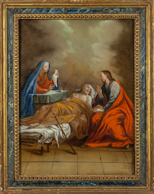 Scuola italiana sec.XVIII "Il transito di San Giuseppe" olio su vetro, cornice coeva in legno e vetro dipinto