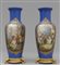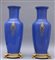 Coppia di vasi in porcellana azzurra decorati a riserve policrome con scene di vita in giardino, basi in bronzo dorato, Francia sec.XIX