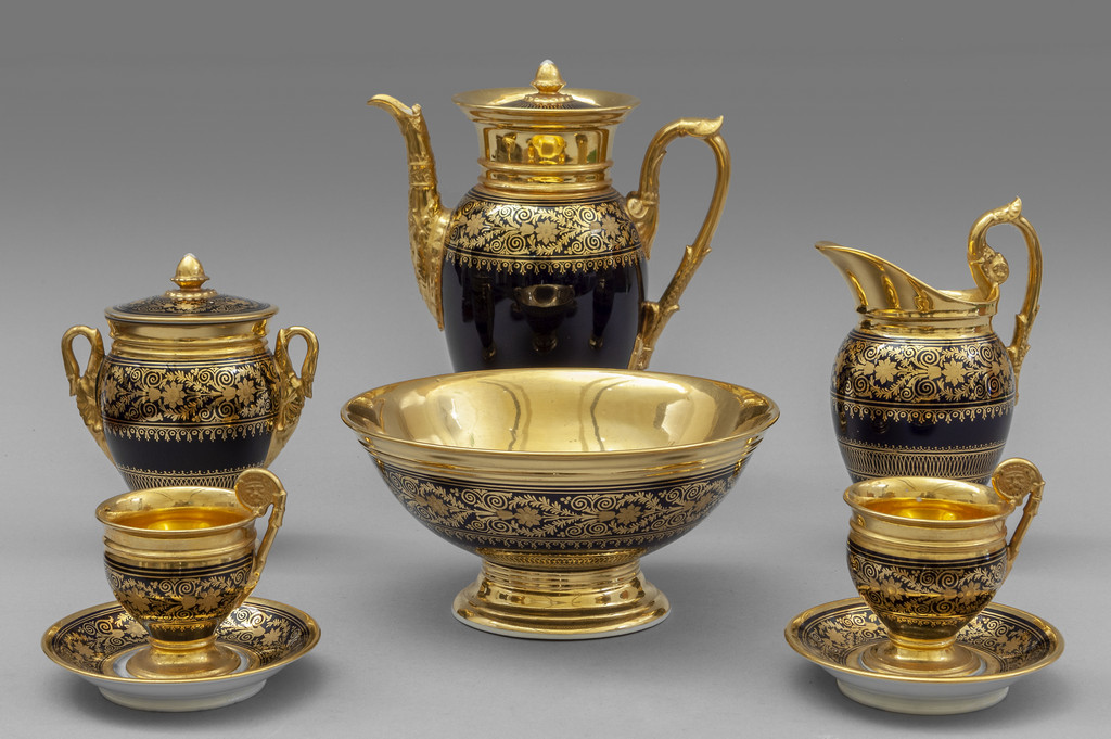 Servizio da the in porcellana blu e oro composto da dodici tazzine, undici piattini, una theiera, una zuccheriera, una lattiera e una biscottiera, Francia sec.XIX