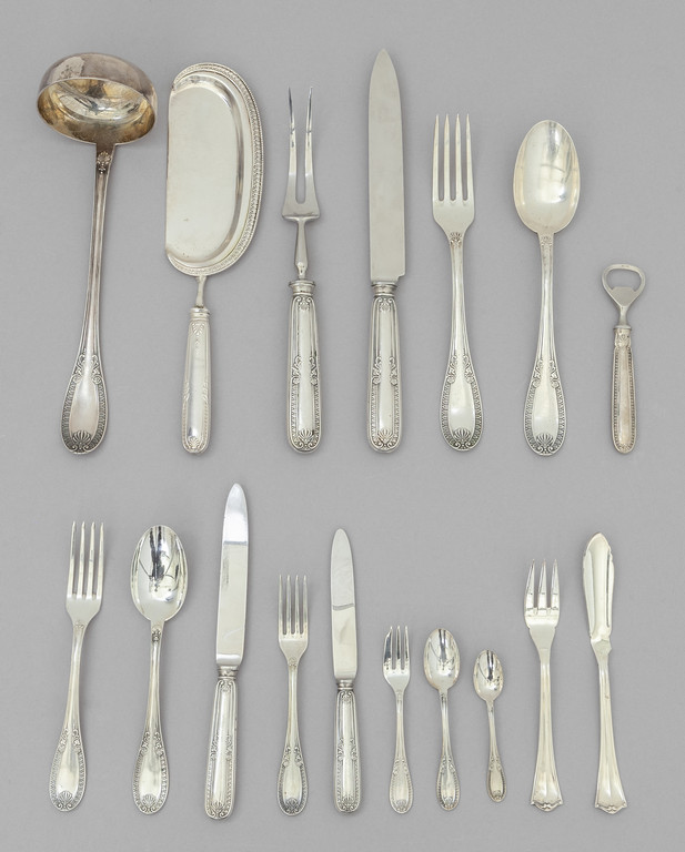 Servizio di posate in argento per 12 composto da 24 forchette grandi, 12 forchette piccole e 12 forchette da ostrica, 12 cucchiai grandi, 12 da dolce e 12 da caffè, 12 coltelli grandi, 12 coltelli piccoli, 1 mestolo, 1 cucchiaione e 1 forchettone, 1 forchetta da arrosto 1 coltello grande, 1 paletta (gr.tot.4700) e 12 forchette e 12 coltelli da pesce in argento non pertinenti (gr.1165)