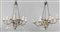 Coppia di lampadari a sei luci, corpo centrale formato da piede di un candeliere in lamierino argentato