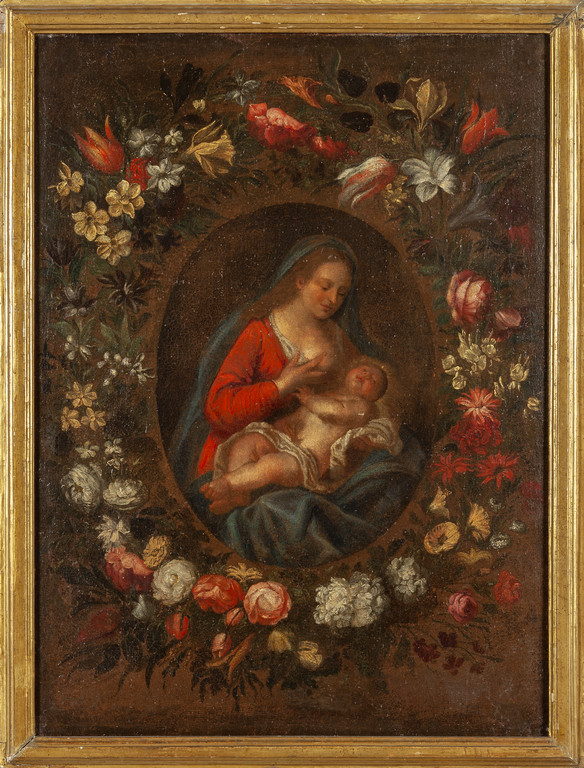 Scuola genovese sec.XVII (G.A.De Ferrari) "Madonna con Bambino circondata da ghirlanda di fiori" olio