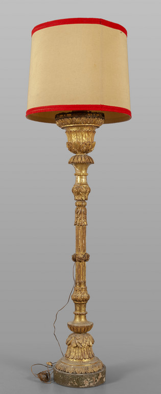 Grande candeliere in legno finemente dorato ed intagliato montato a lampada, fine sec.XVIII