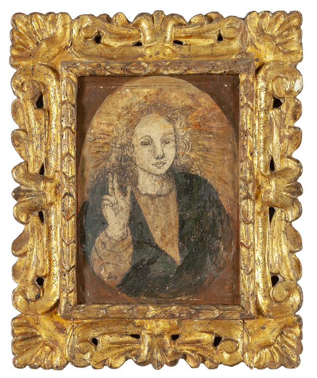 Scuola italiana sec.XVII "Cristo Benedicente" tempera su carta, cornice antica in legno intagliato e dorato