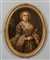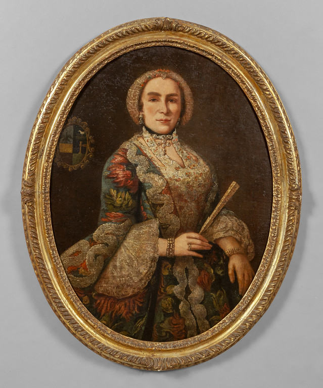 Scuola bergamasca sec.XVIII "Ritratto di gentildonna con ventaglio e stemma nobiliare" olio di forma ovale, cornice coeva in legno intagliato e dorato