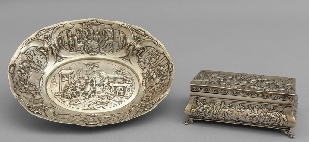 Scatola e vassoietto in argento sbalzato a motivi di feste paesane, sec.XIX