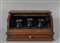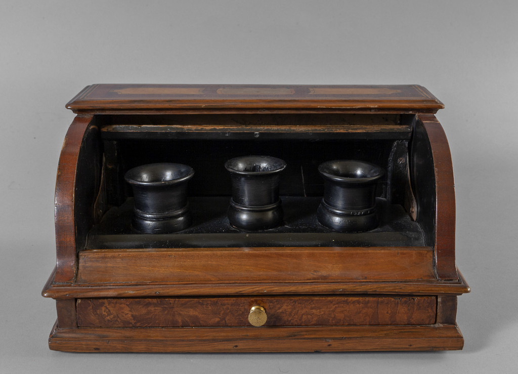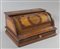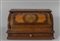 Calamaio in legno intarsiato in legni vari, lo sprtello girevole cela all'interno tre boccettine