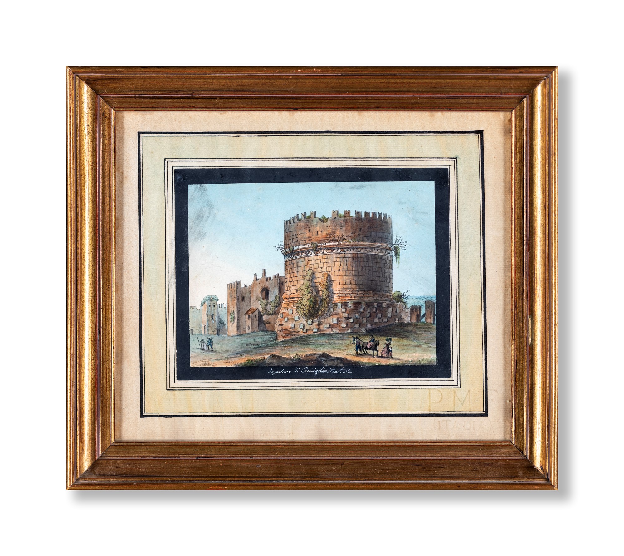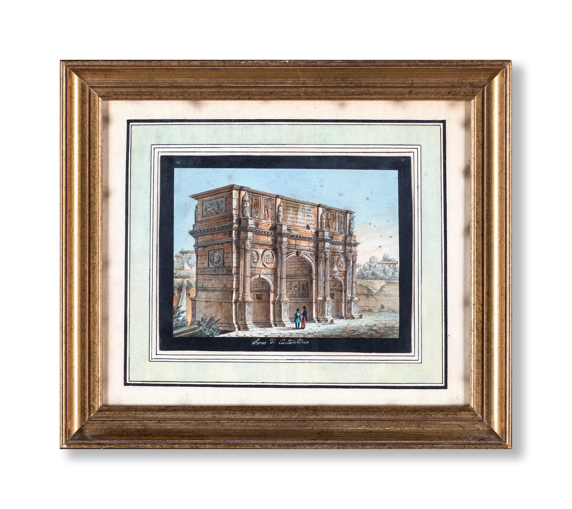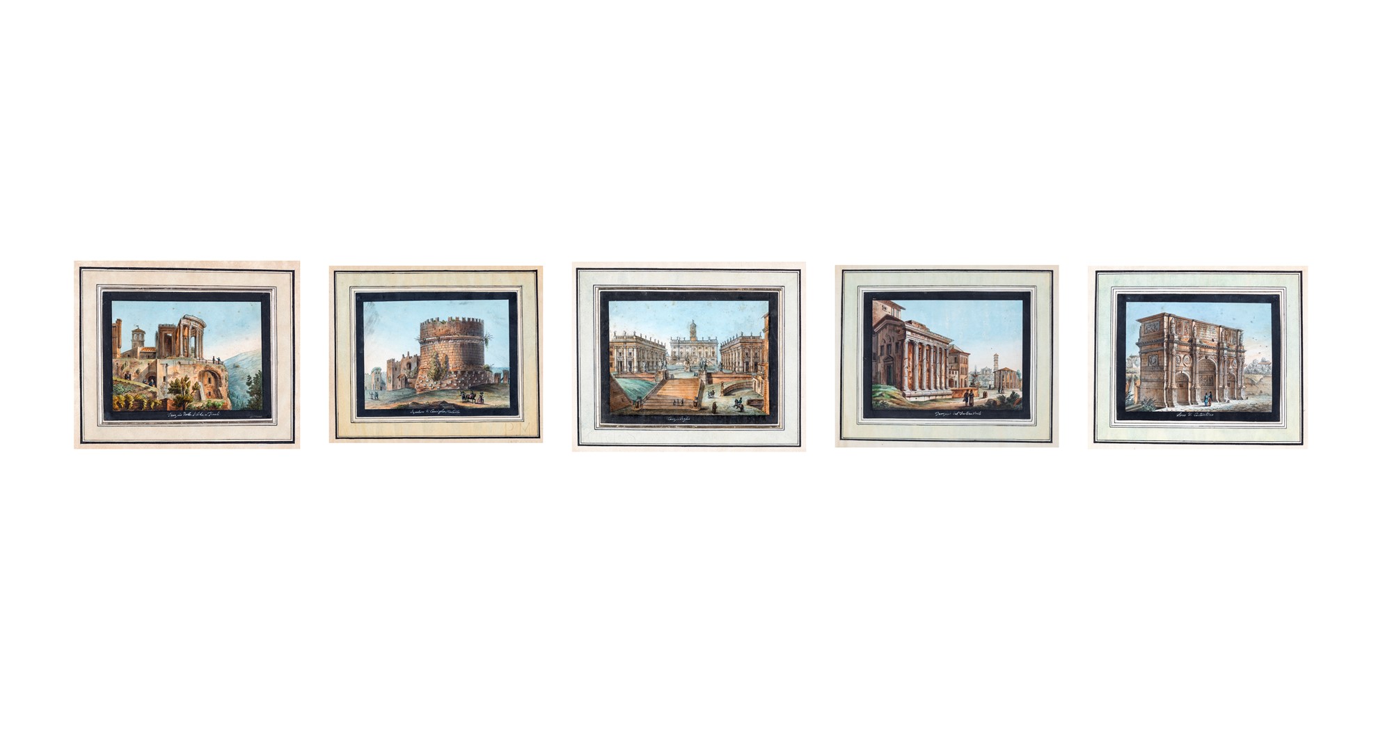 Pittore del XIX secolo - Cinque vedute di Roma - raffiguranti il tempio della Sibilla a Tivoli, l'arco di Costantino, il tempio della Fortuna Virile e di Ercole vincitore, il Campidoglio e il sepolcro di Cecilia Metella. Quest'ultimo reca firma in basso al centro non identificata e data 1895. - delineati acquerellati - cm 14x18