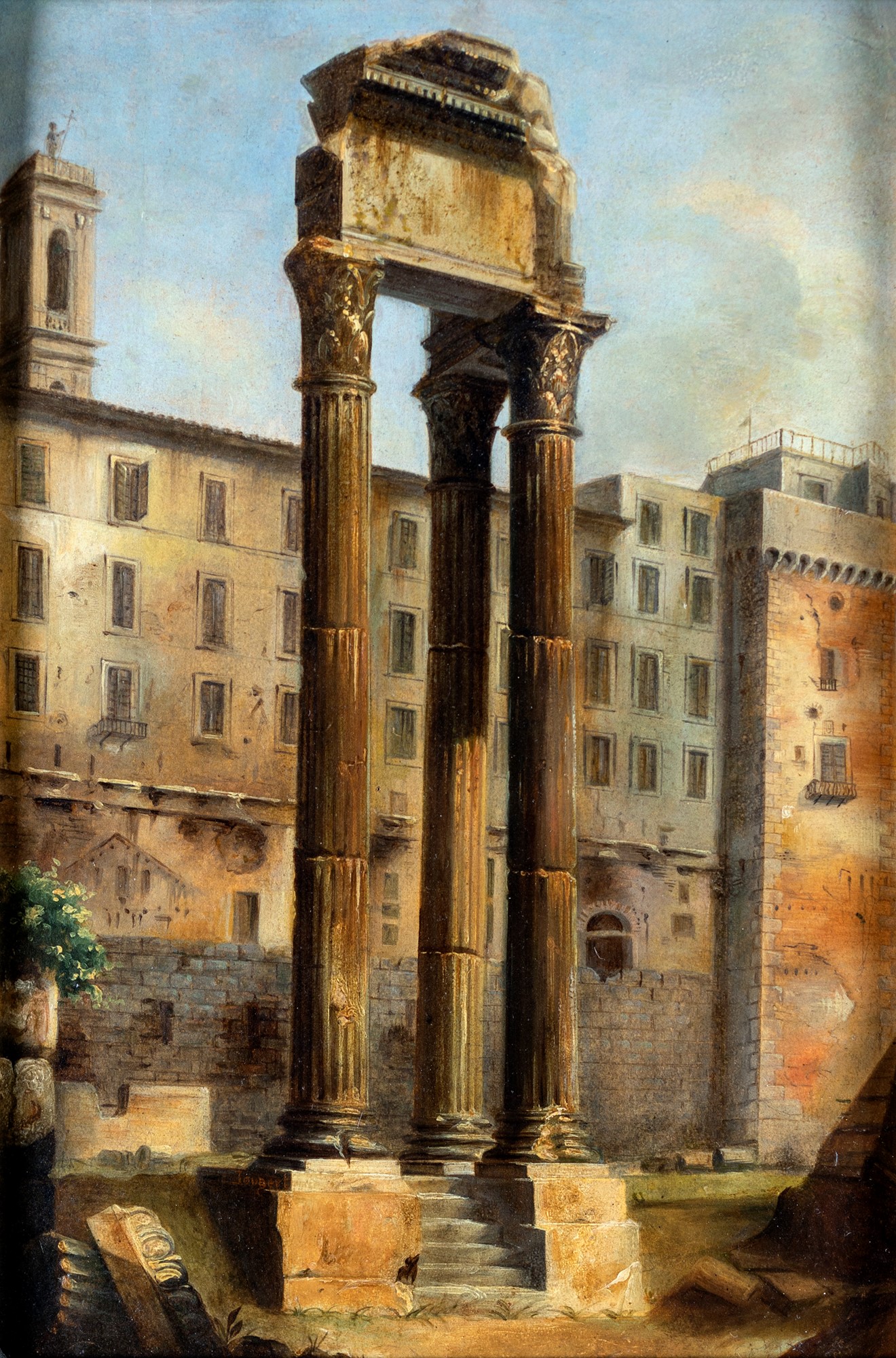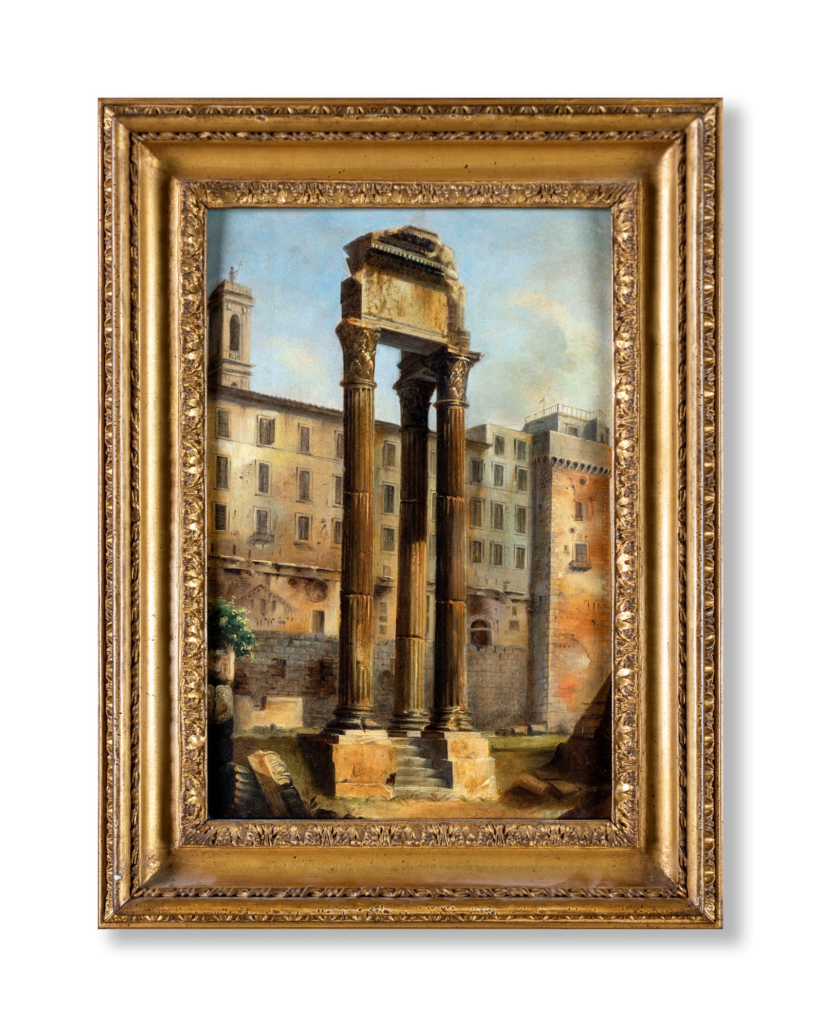 Léon Alexandre Alphonse Joubert - Resti del tempio di Giove al Foro - Firmato in basso a sinistra: Joubert - olio su carta applicata su cartone - cm 38x25