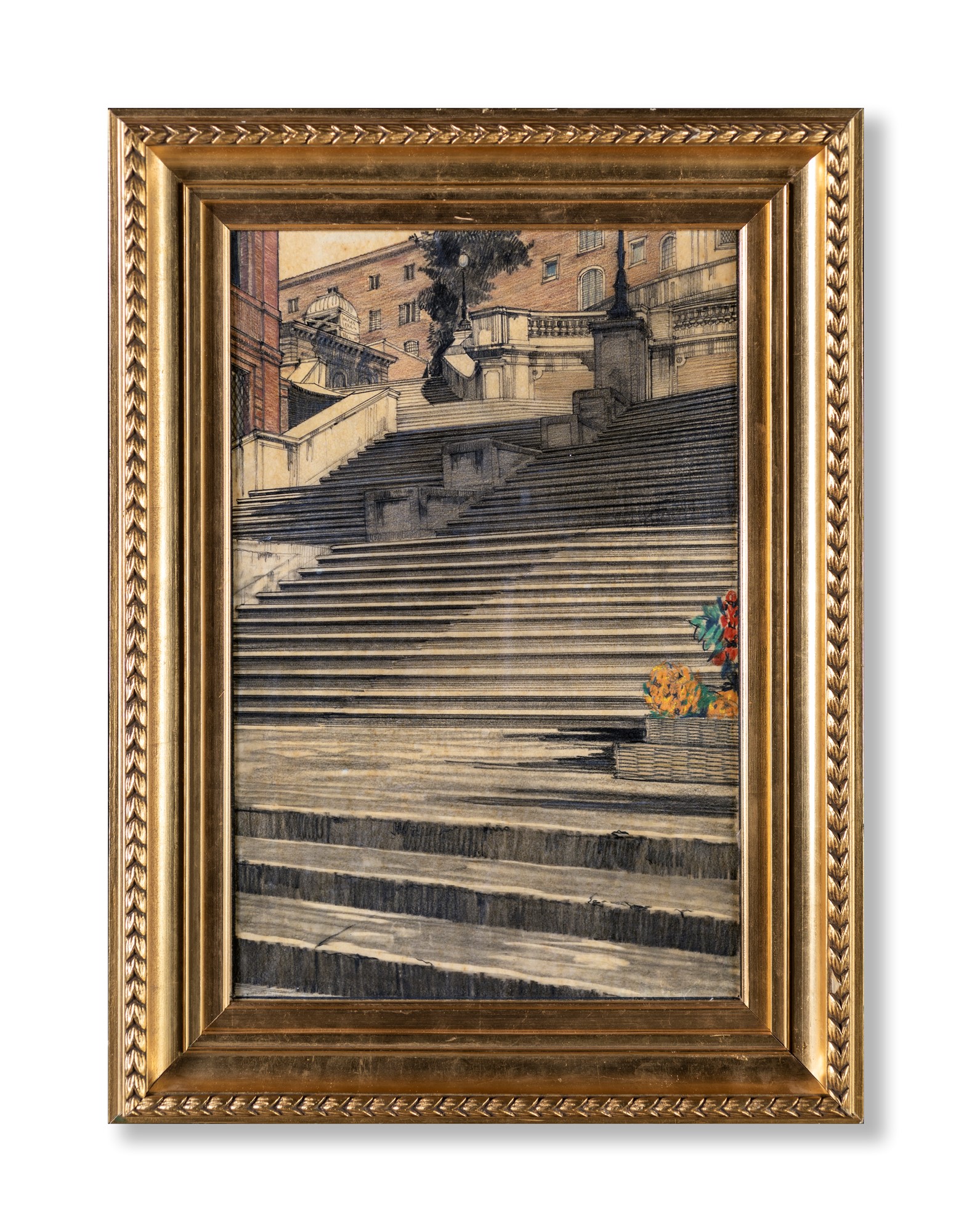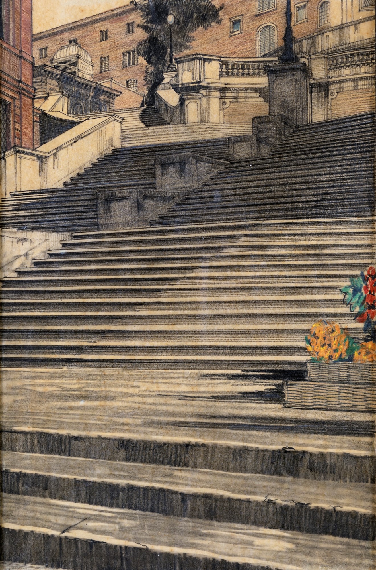 Pittore degli inizi del XX secolo - Scorcio della scalinata di Trinità dei Monti - tecnica mista su carta lucida - cm 46x31
