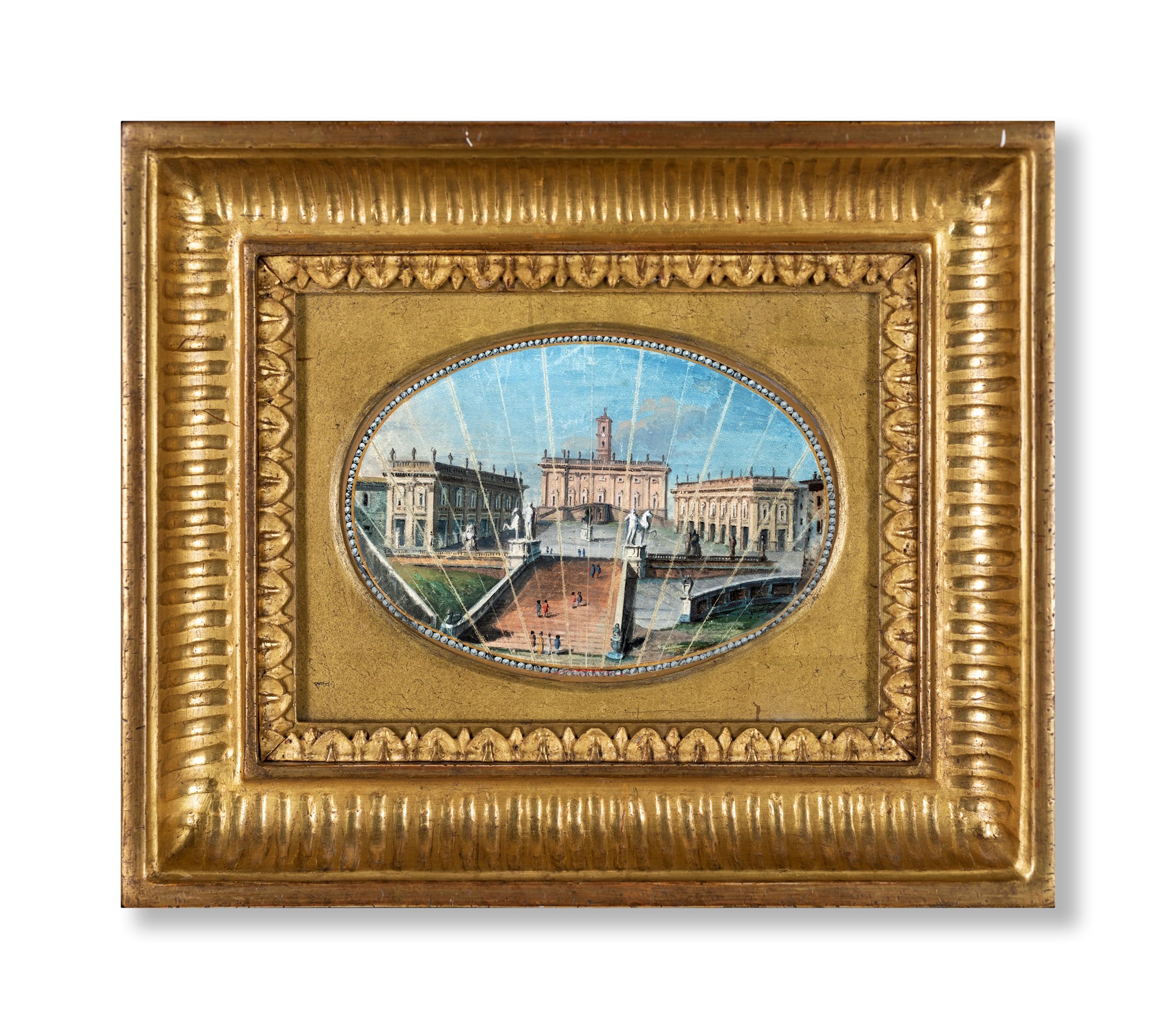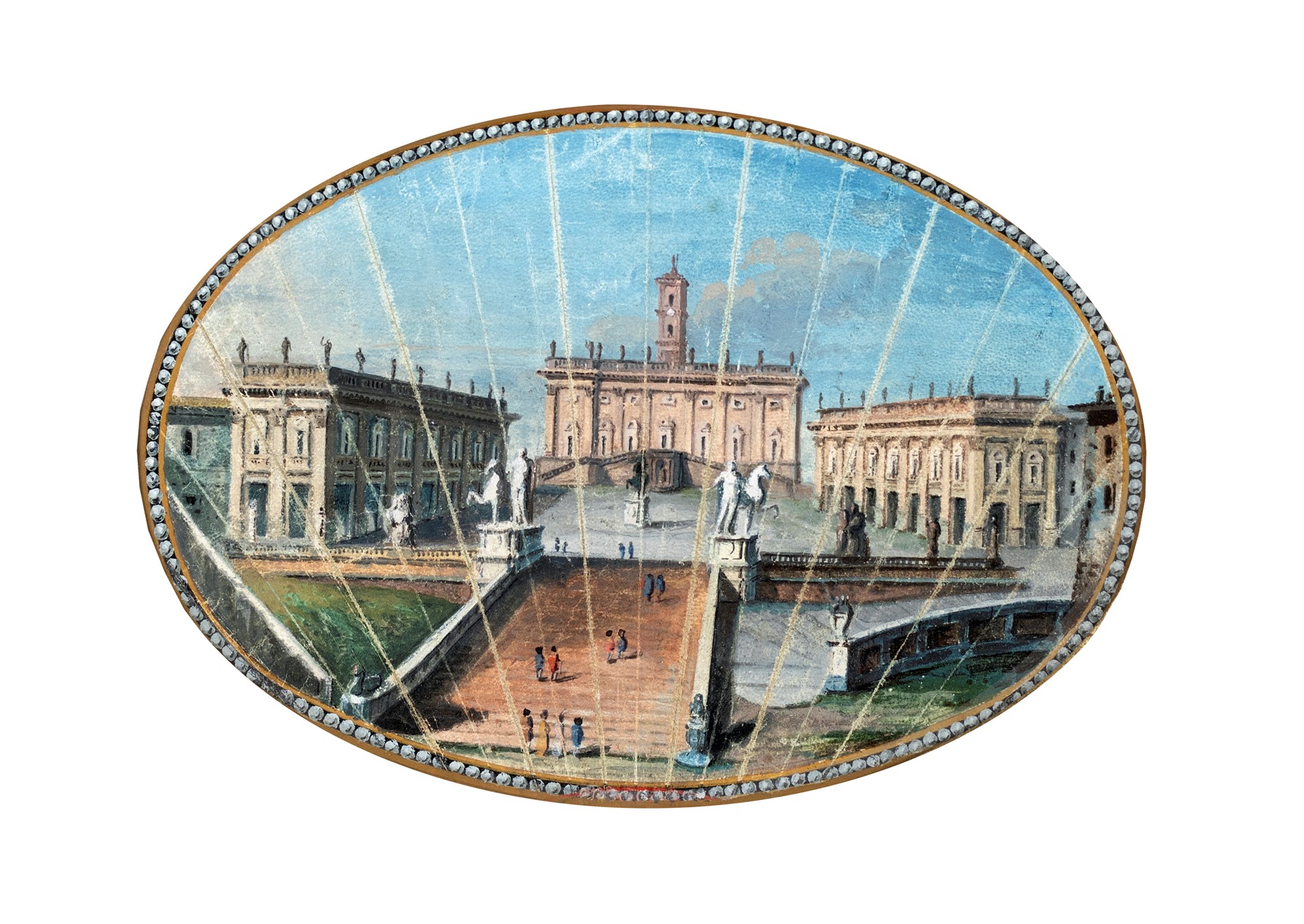 Tommaso Bigatti - La scalinata dell'Ara Coeli e la piazza del Campidoglio - veduta centrale da una pagina di ventaglio - tempera su pergamena ovale - cm 11x16,5