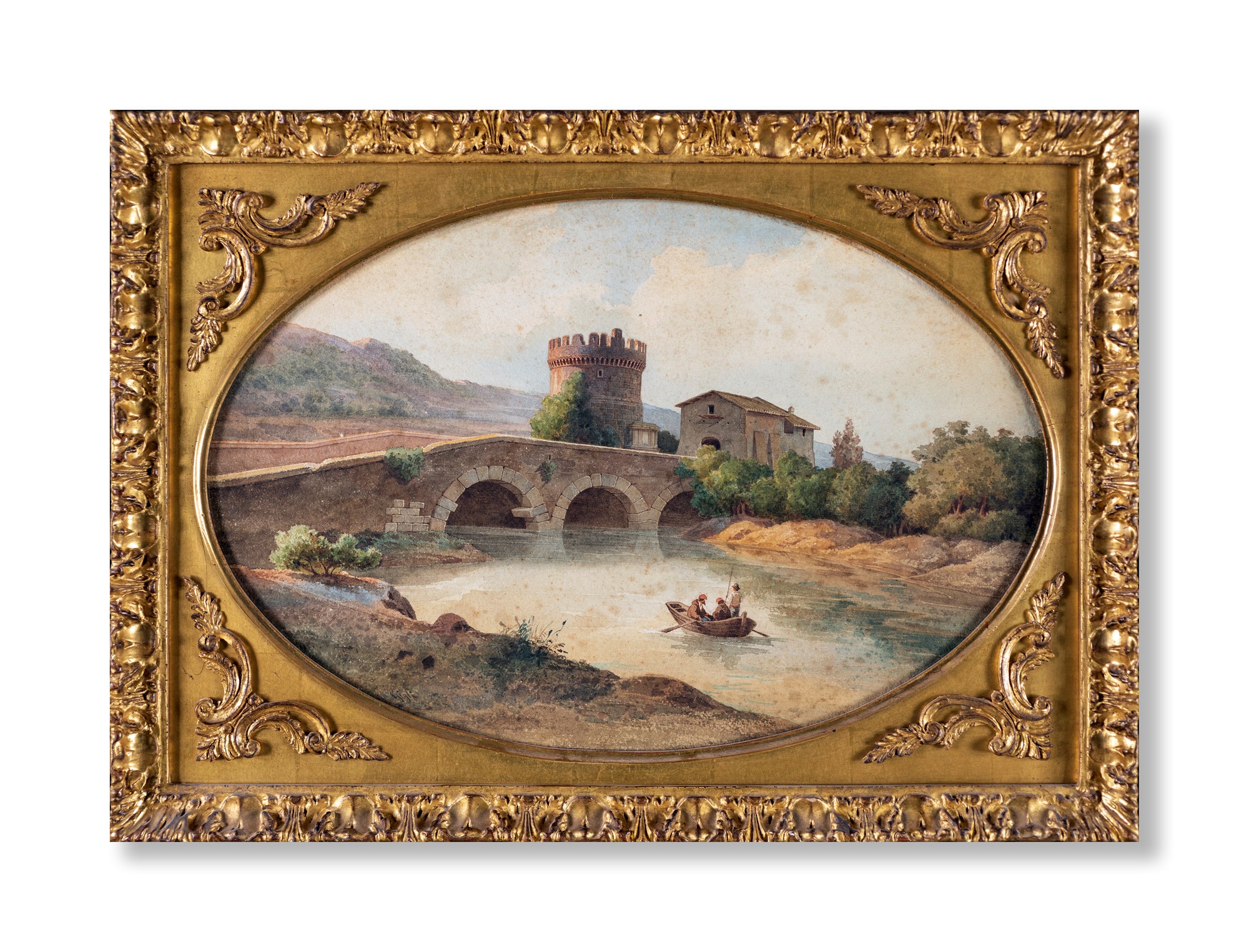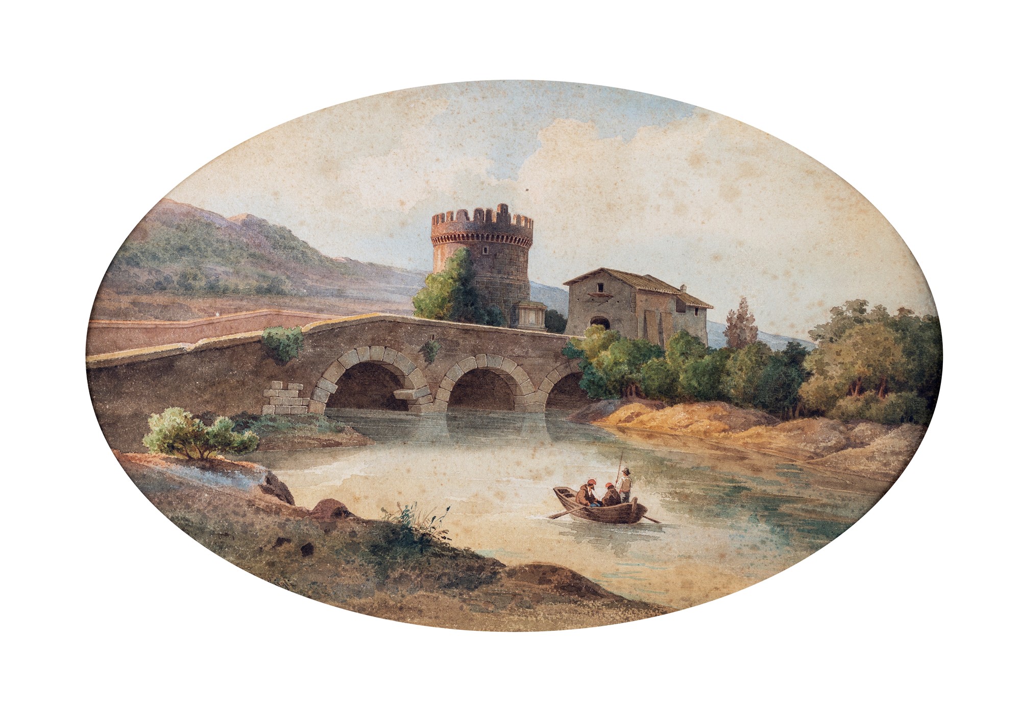 Roberto Gigli - Veduta del Ponte Lucano con il sepolcro dei Plauzi nei pressi di Tivoli - Firmato in basso a sinistra: Gigli - acquerello ovale su carta - cm 30x47