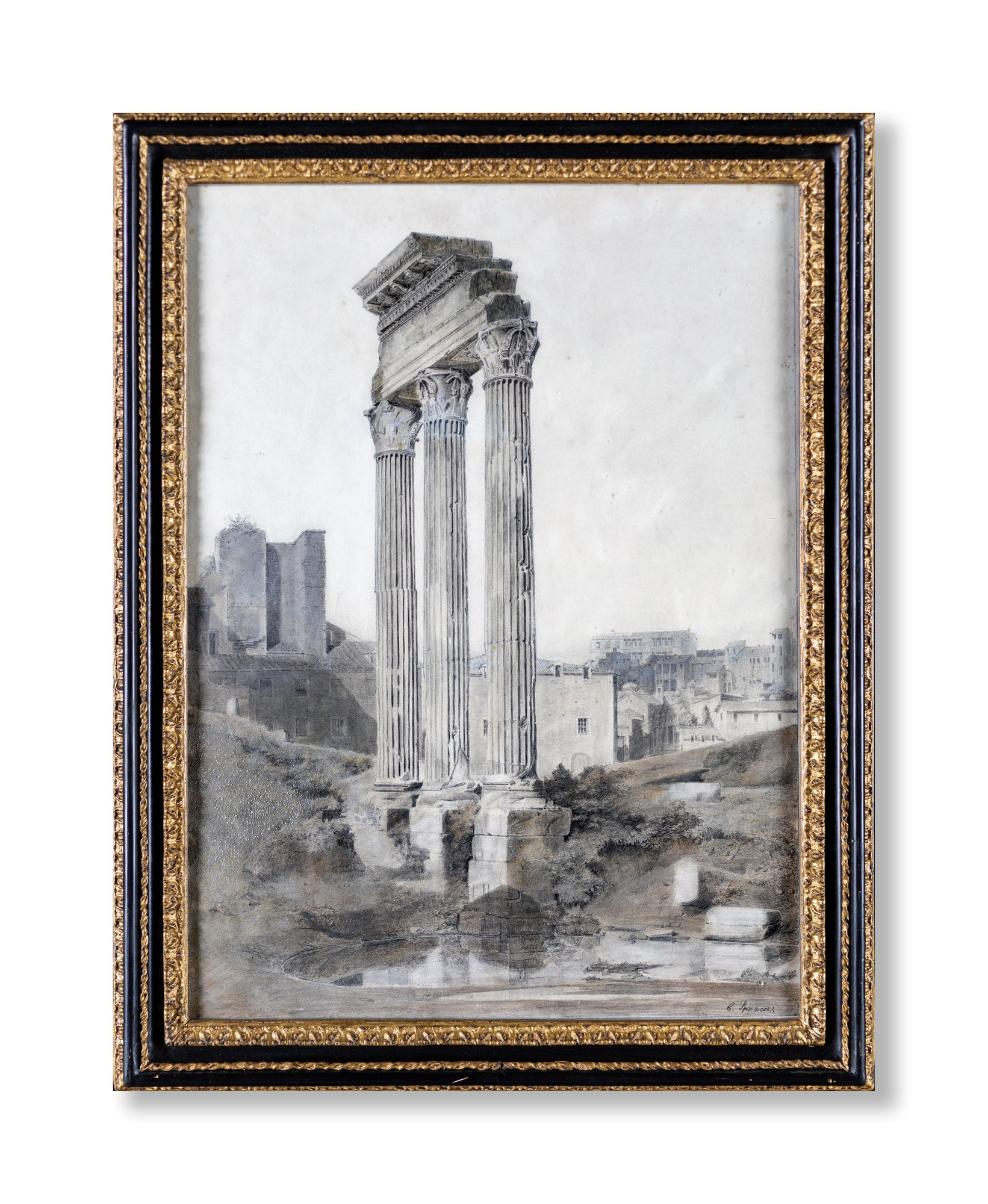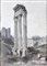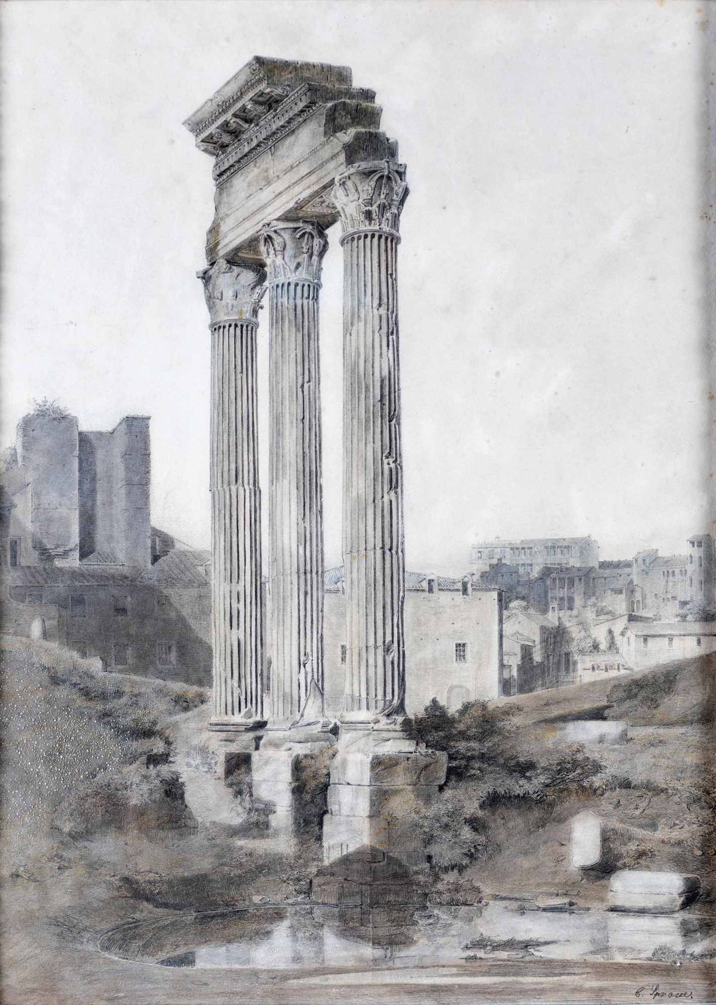 Carl Ferdinand Sprosse - Resti del tempio dei Dioscuri al Foro - Firmato in basso a destra - matita e acquerello monocromo su carta - cm 45x37