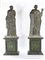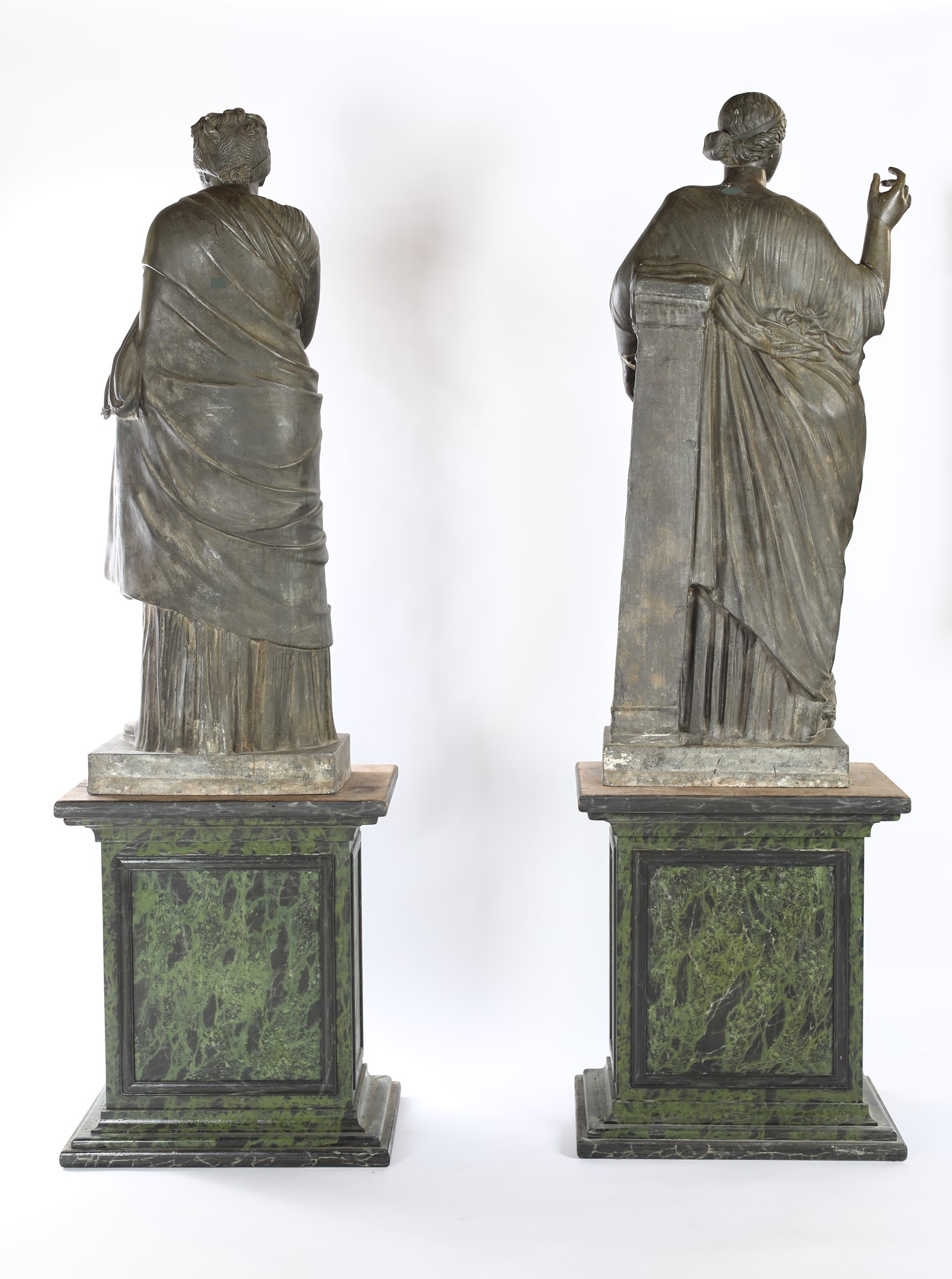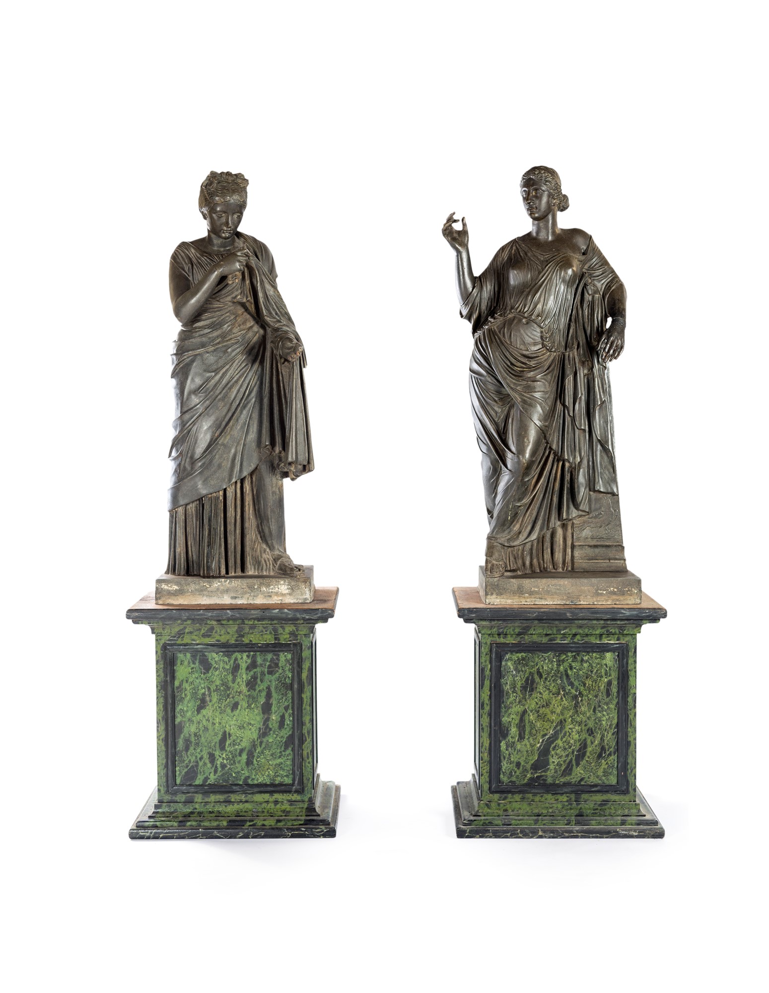 Due vestali in lega metallica, XIX secolo - desunte dal repertorio classico, stanti su piedistalli squadrati in legno dipinto ad imitazione del marmo verde. Recano un'etichetta lungo il profilo laterale della base con iscritto Miroy Frères Paris. I Miroy Freres, noti in particolare per i loro bronzi e orologi, erano un'azienda a conduzione familiare che lavorò a Parigi per un paio di generazioni. Difetti. - altezza complessiva cm 216 - la figure: altezza cm 142; la base: cm 74x66x47