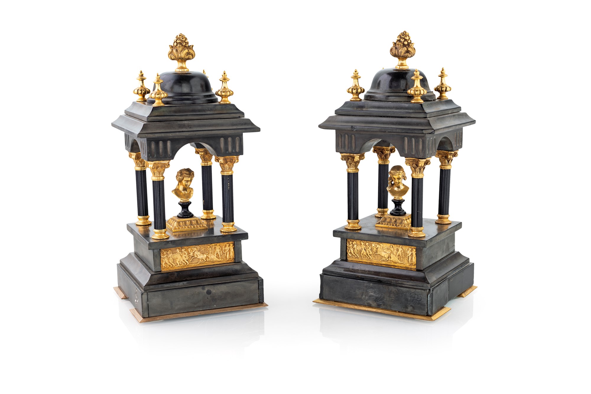 Coppia di tempietti in marmo nero, metà del XIX secolo - a pianta quadrangolare ad includere piccoli busti dall'antico; finiture ornamentali in bronzo dorato arricchiscono la sommità, caratterizzano le colonna e ornano la parte frontale del basamento - cm 30x15x15