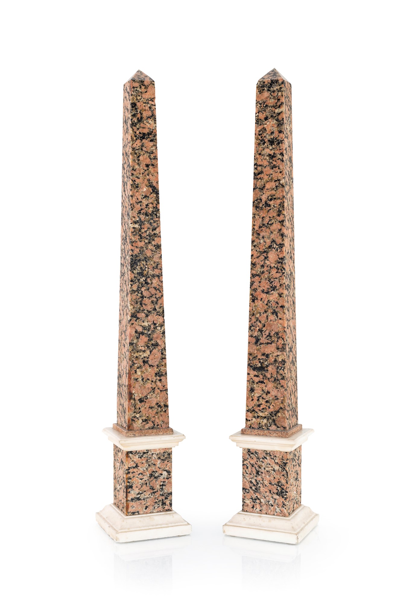 Coppia di grandi obelischi in granito, XIX secolo - su piedistalli squadrati con base in marmo bianco - cm 90x15x15