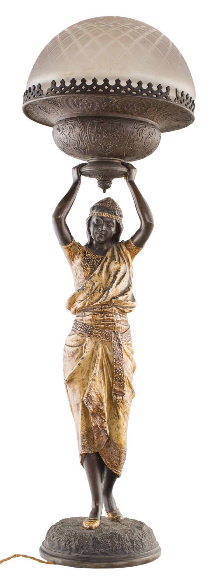 Louis Hottot - Lampada da tavolo in metallo patinato e dipinto - in forma di giovane egiziana ritratta con le braccia sollevate a sostegno di una coppa portalampada completa di campana in vetro. Firmata sulla base: L. Hottot - altezza cm 97