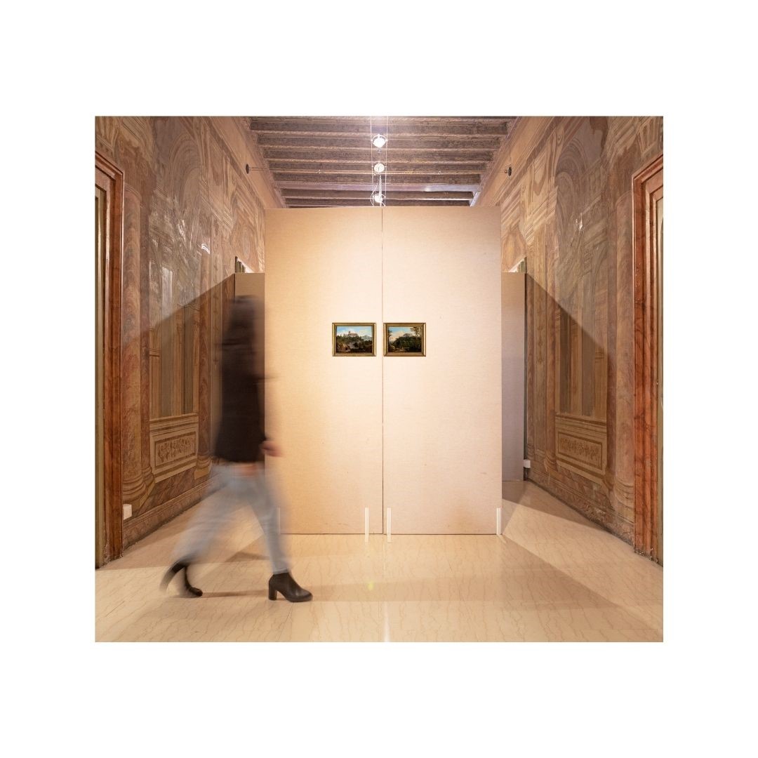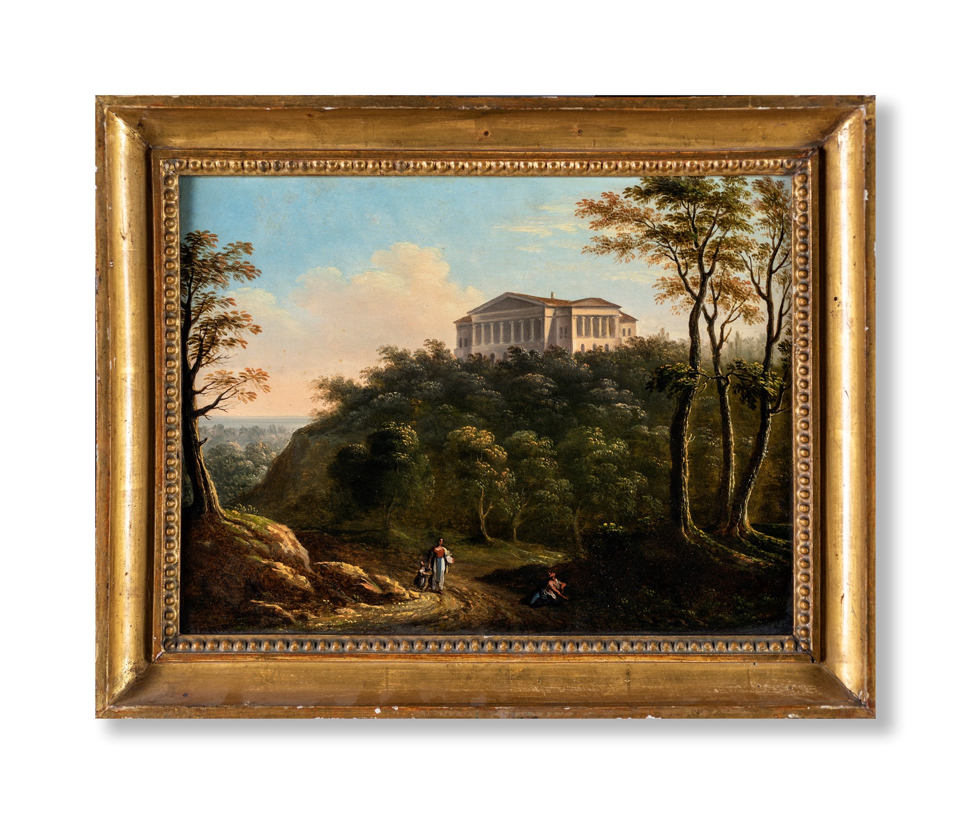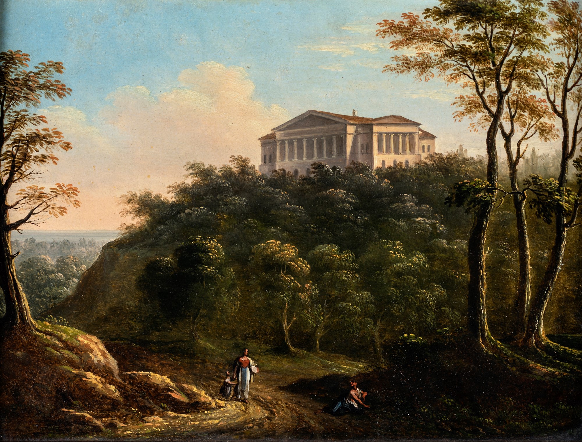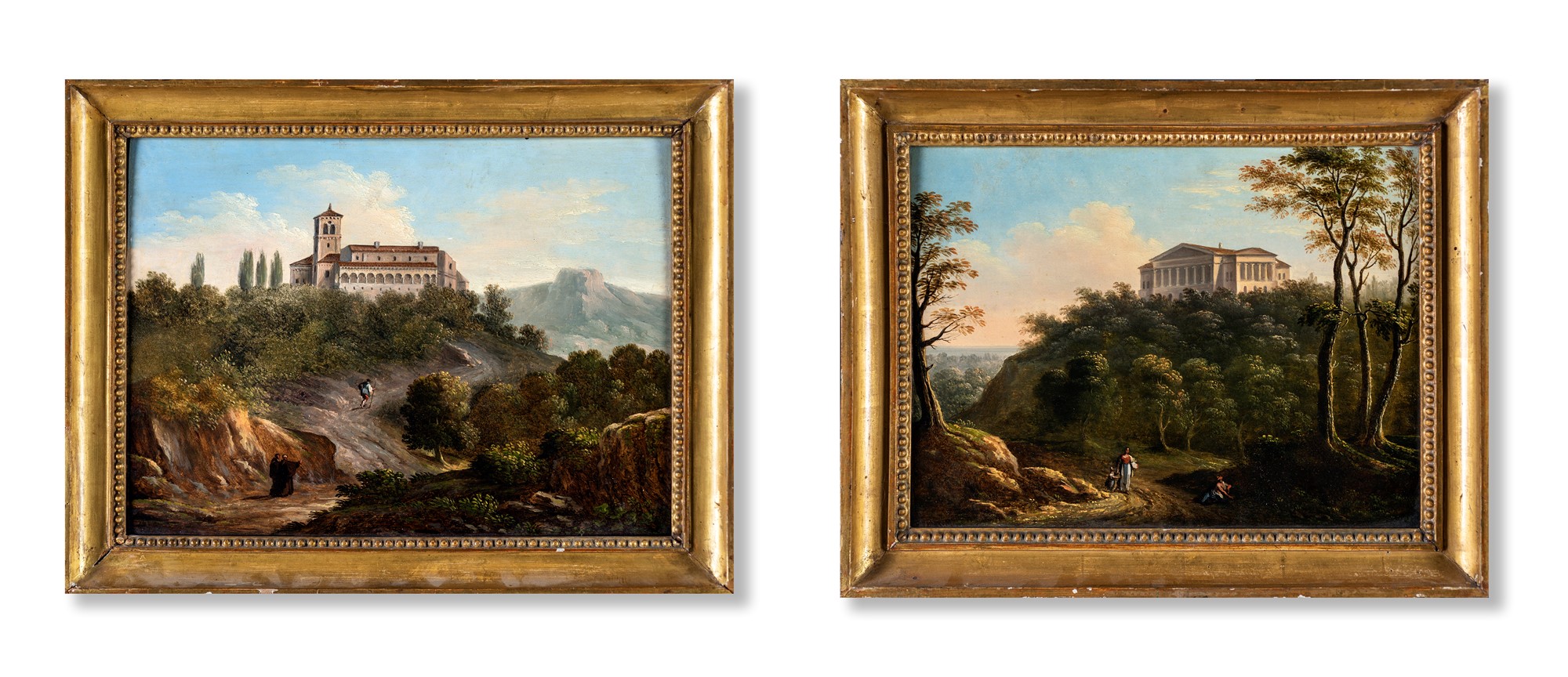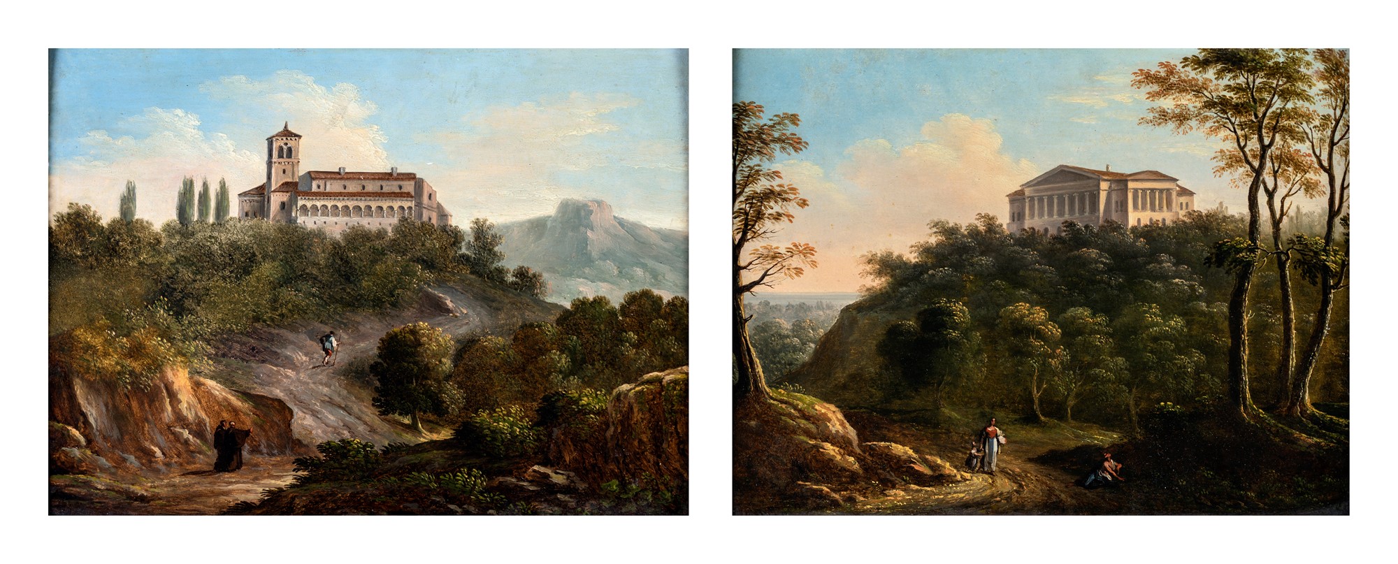Pittore fine XVIII/inizio XIX secolo - a) Paesaggio con l'Eremo dei Camaldoli b) Paesaggio con palazzo neoclassico - coppia di olii su tavola - cm 25x33