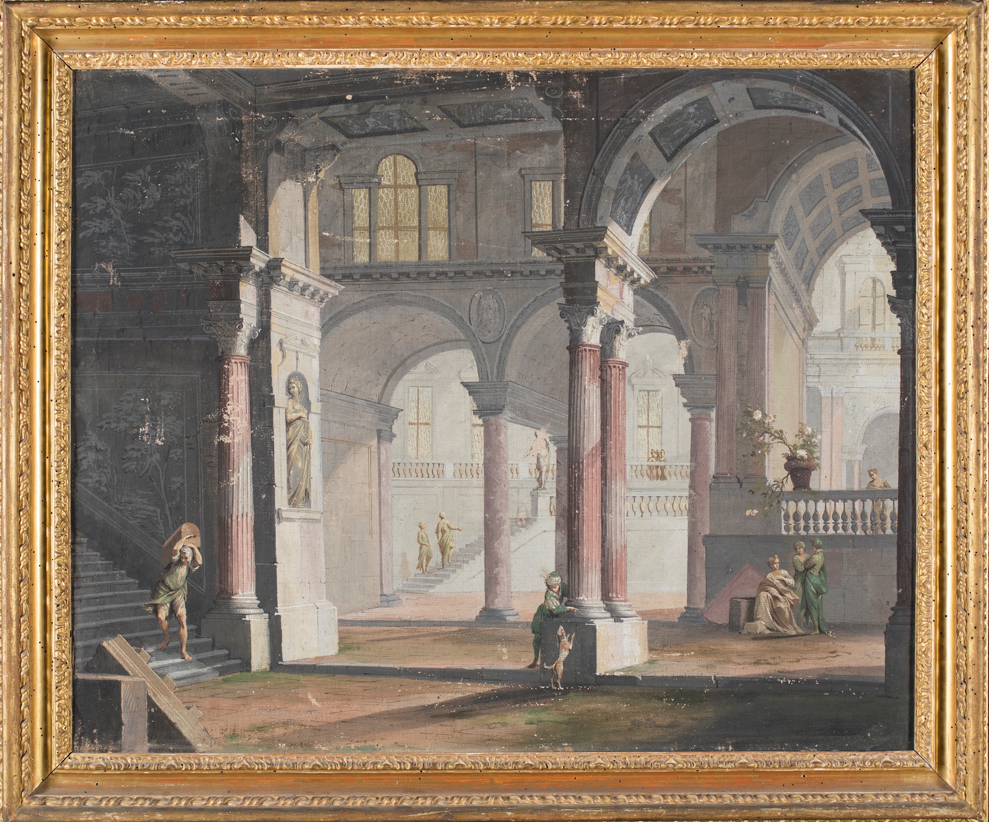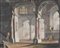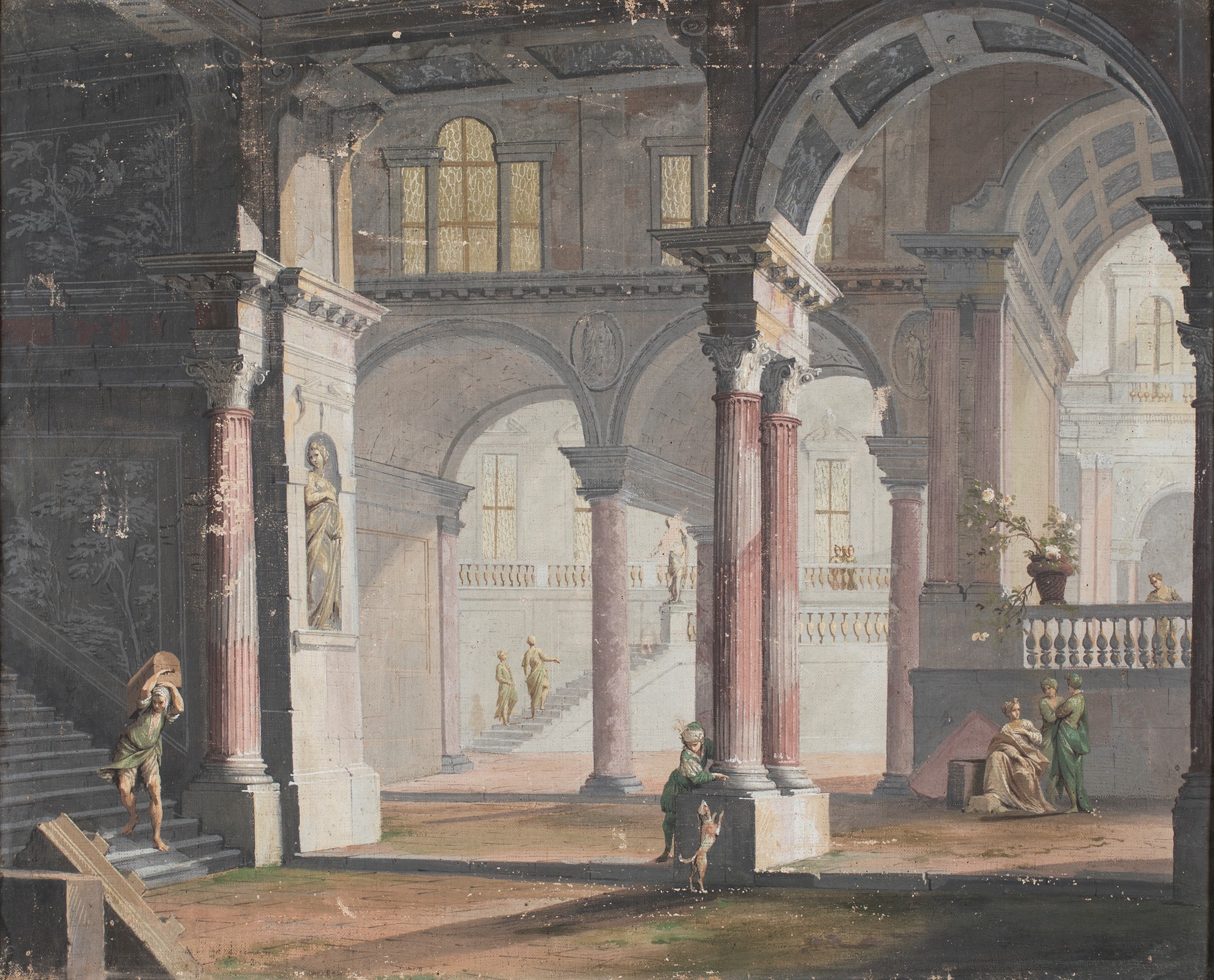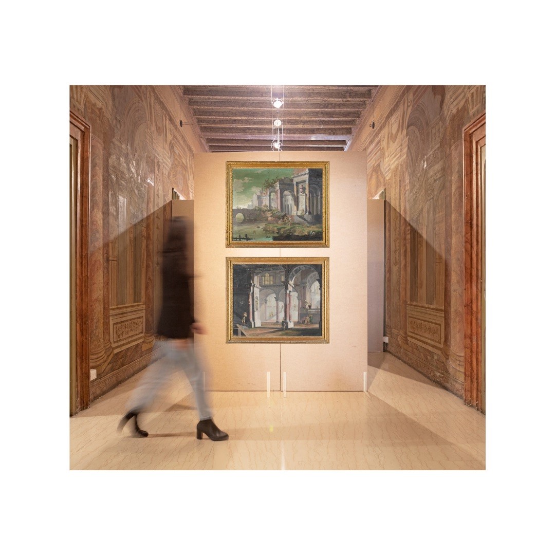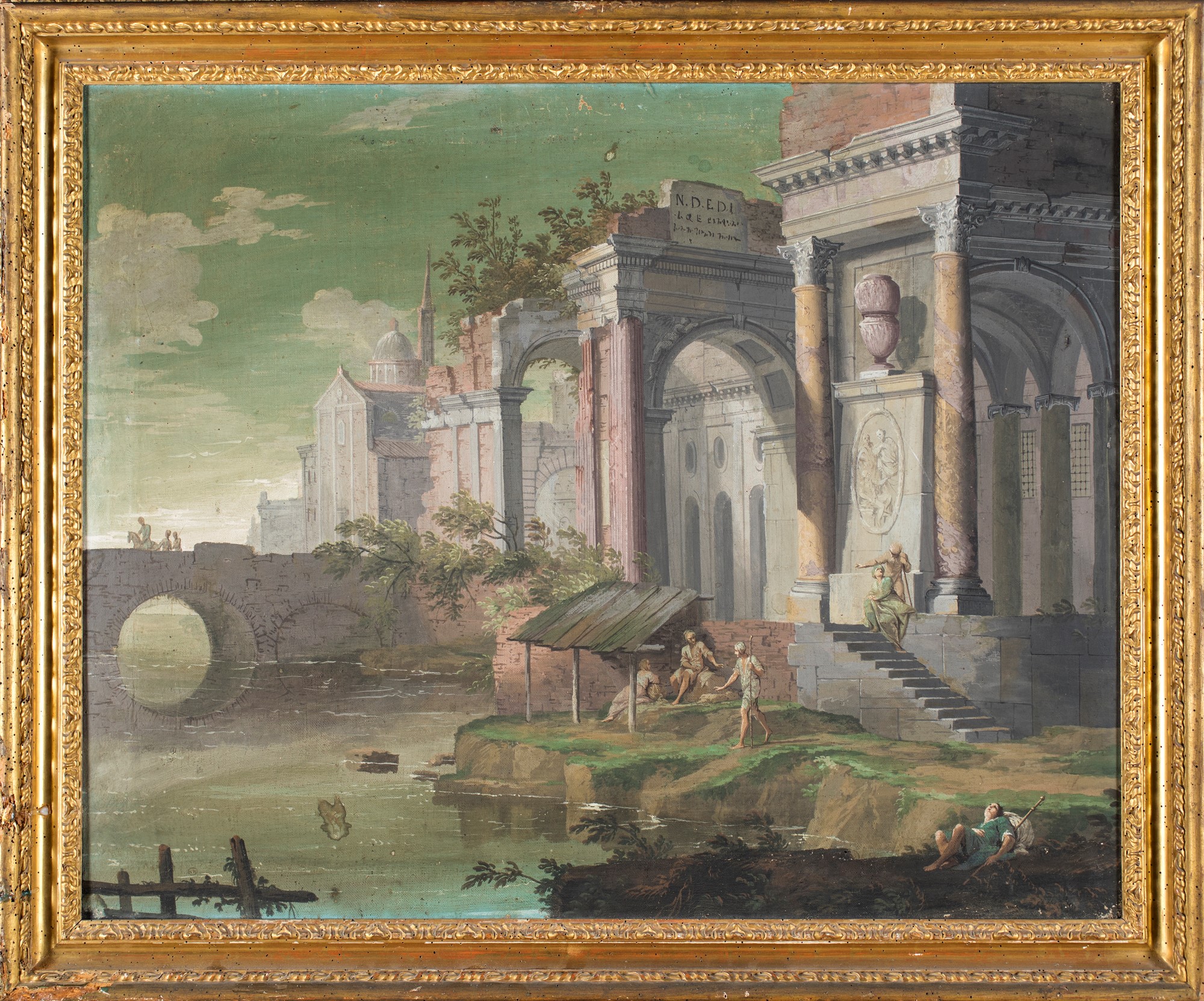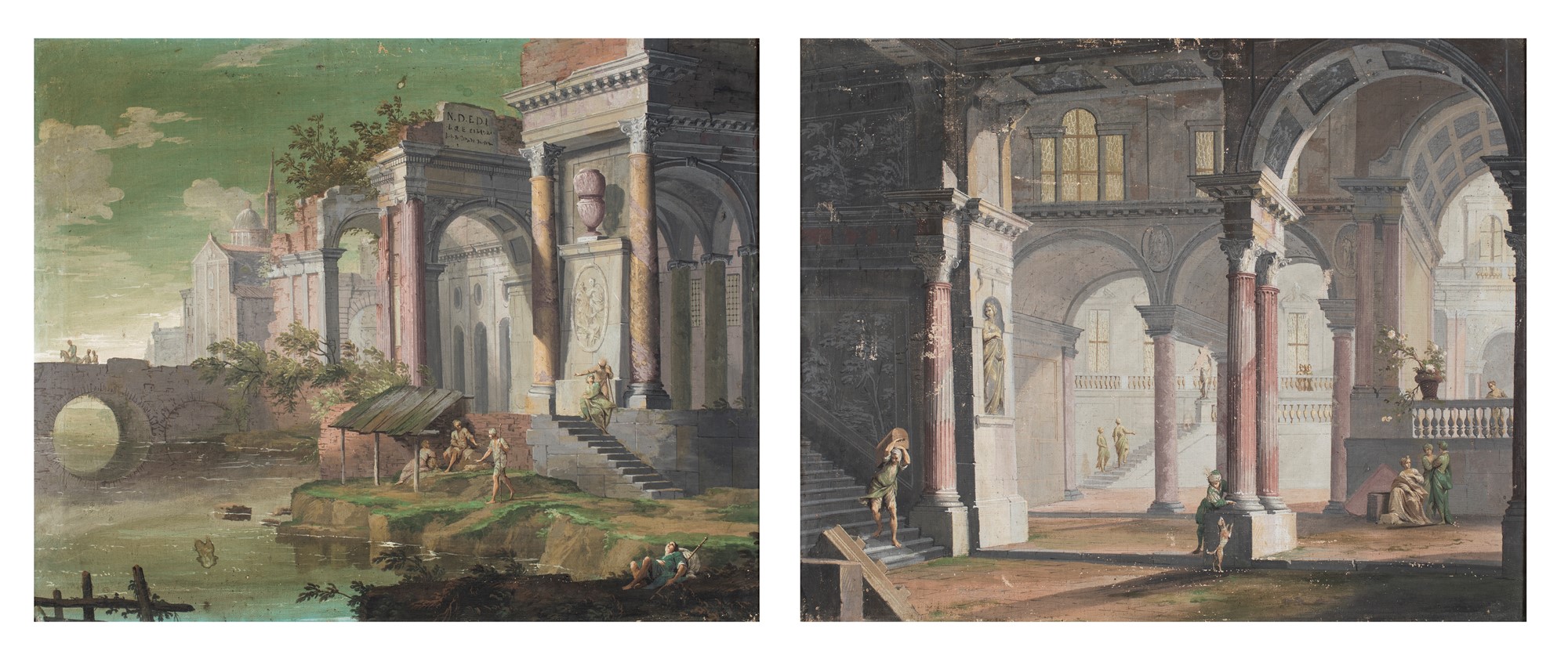 Pietro Paltronieri detto Il Mirandolese - a) Paesaggio fluviale con capriccio architettonico b) Interno architettonico con figure - coppia di tempere su tela - cm 77x95