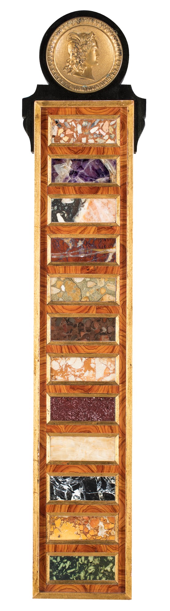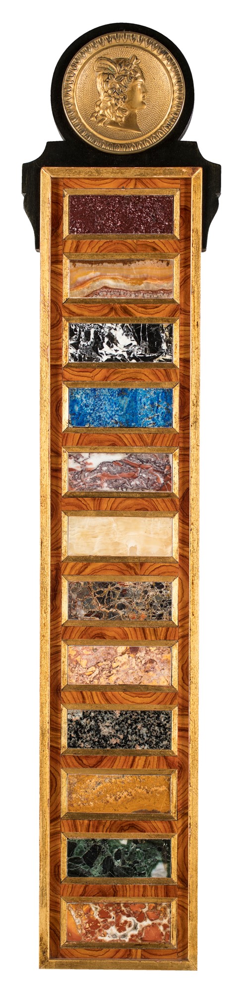 Campionatura di marmi vari e pietre dure - composta da ventiquattro placchette rettangolari racchiuse da profili dorati e disposte in colonna su due lesene in legno; la sommità è caratterizzata da un medaglione circolare in metallo dorato con profilo classico - cm 80x17 ognuna