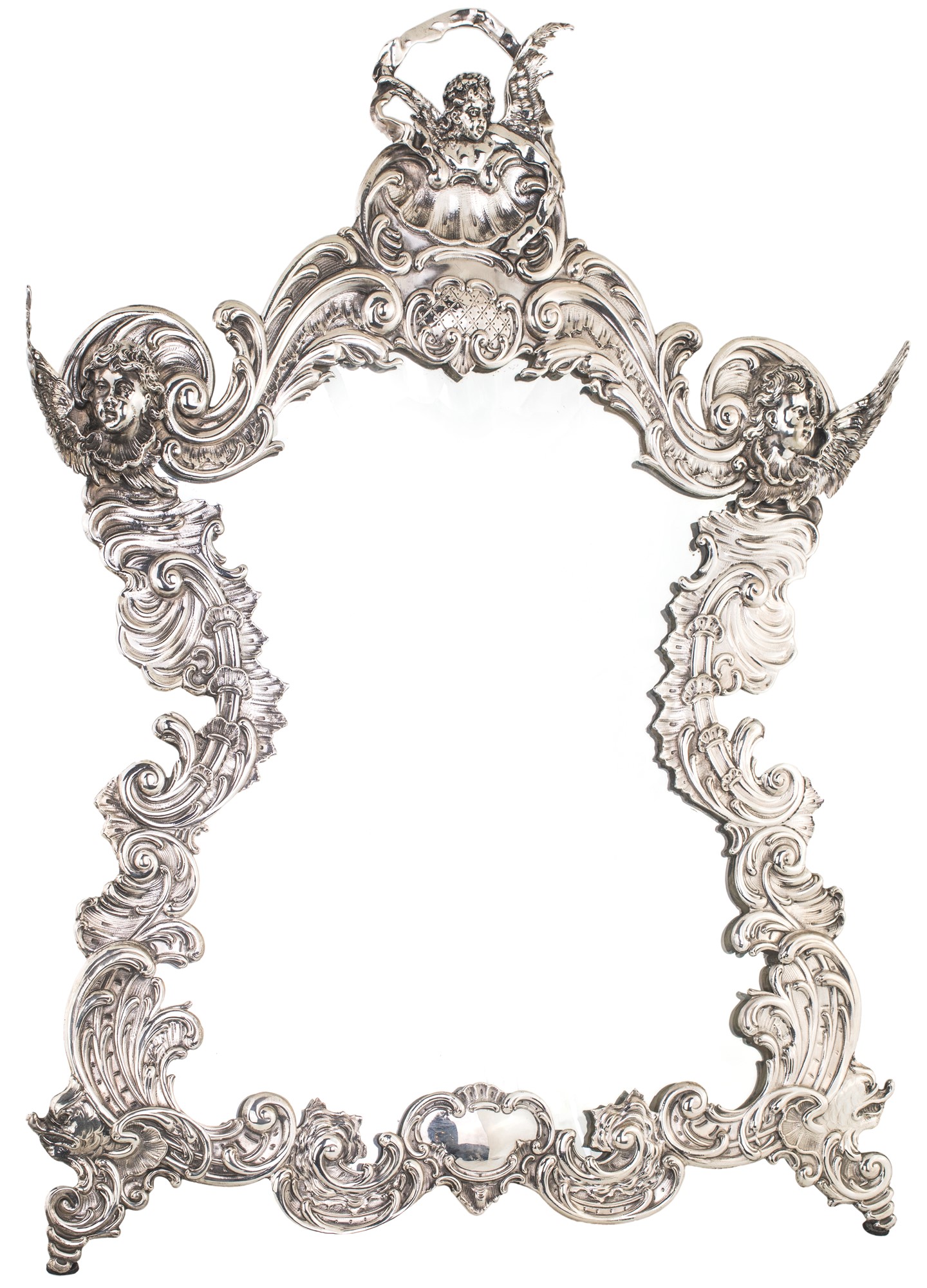Grande specchiera da tavolo in argento 950/1000, Vienna, 1840 ca. - con cornice sagomata costituita da volute e cartigli simmetricamente disposti; arco superiore delimitato da cherubini - cm 71x59x28