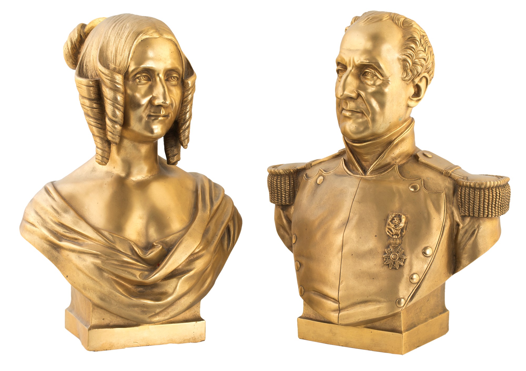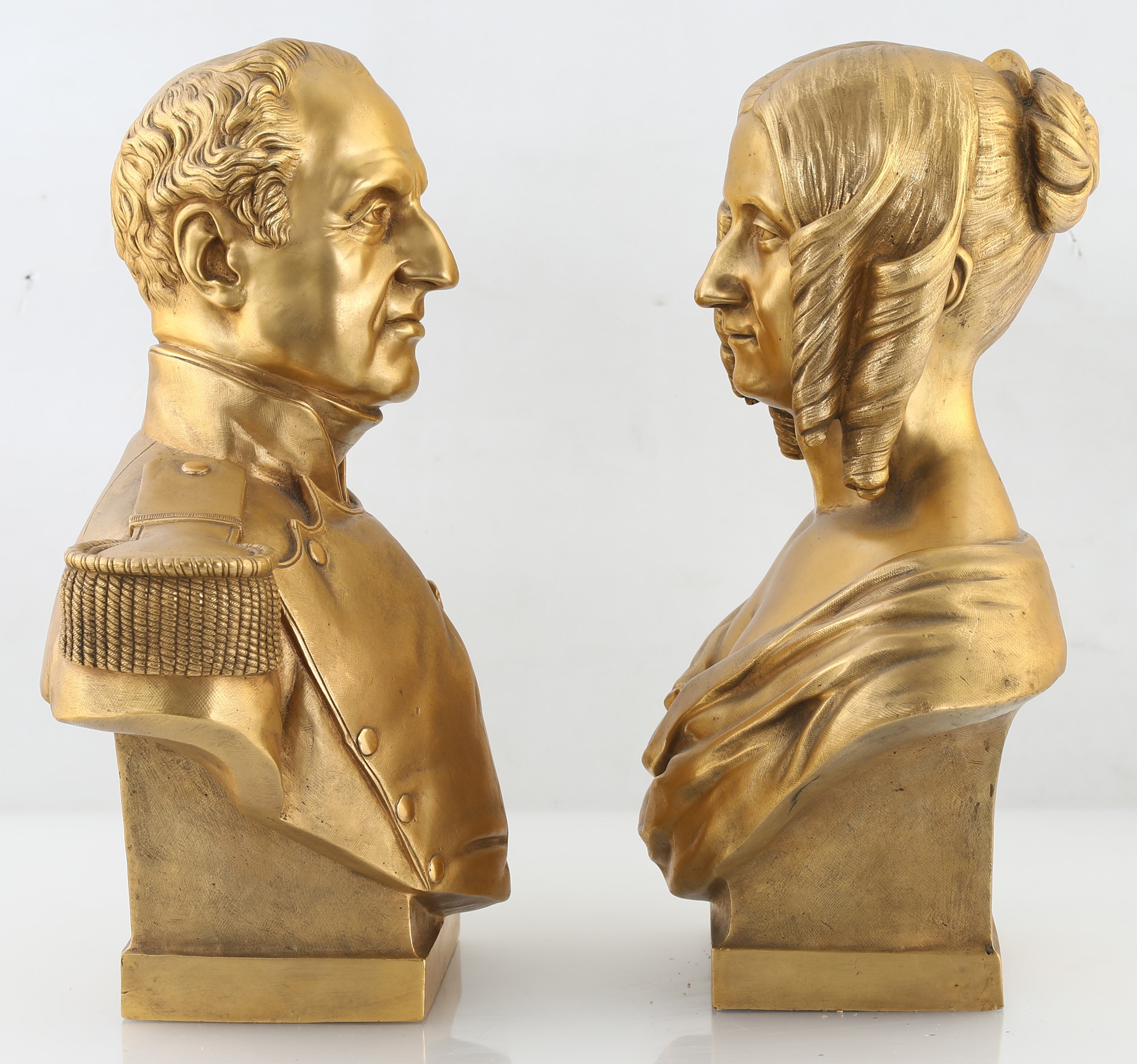 Coppia di busti in bronzo dorato, XIX secolo - raffiguranti un ufficiale francese con insegna dell'Ordine della Legion d'Onore (versione regia) e la sua consorte - altezza cm 33