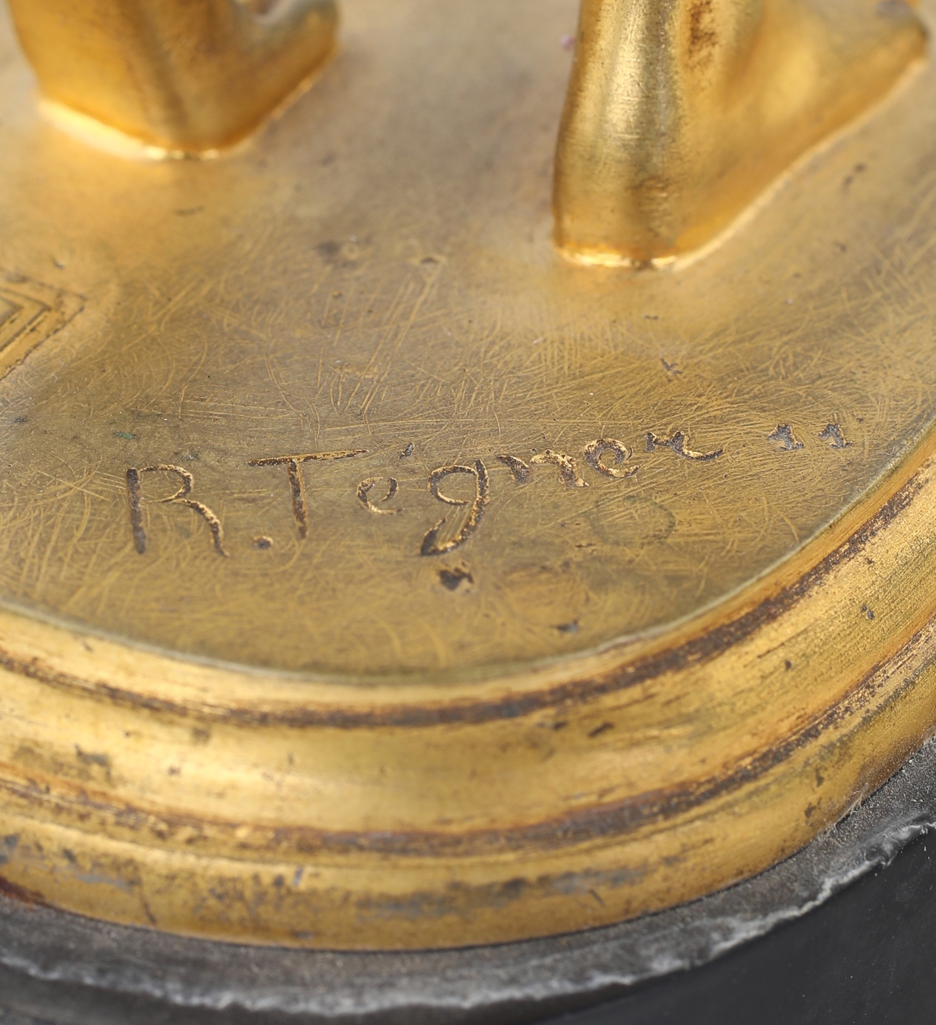 Rudolph Christopher Puggard Tégner - Leda e il cigno - Base ovale in marmo. Firmata sulla base R. Tégner e bollo di fonderia La Stele - bronzo dorato - altezza cm 27