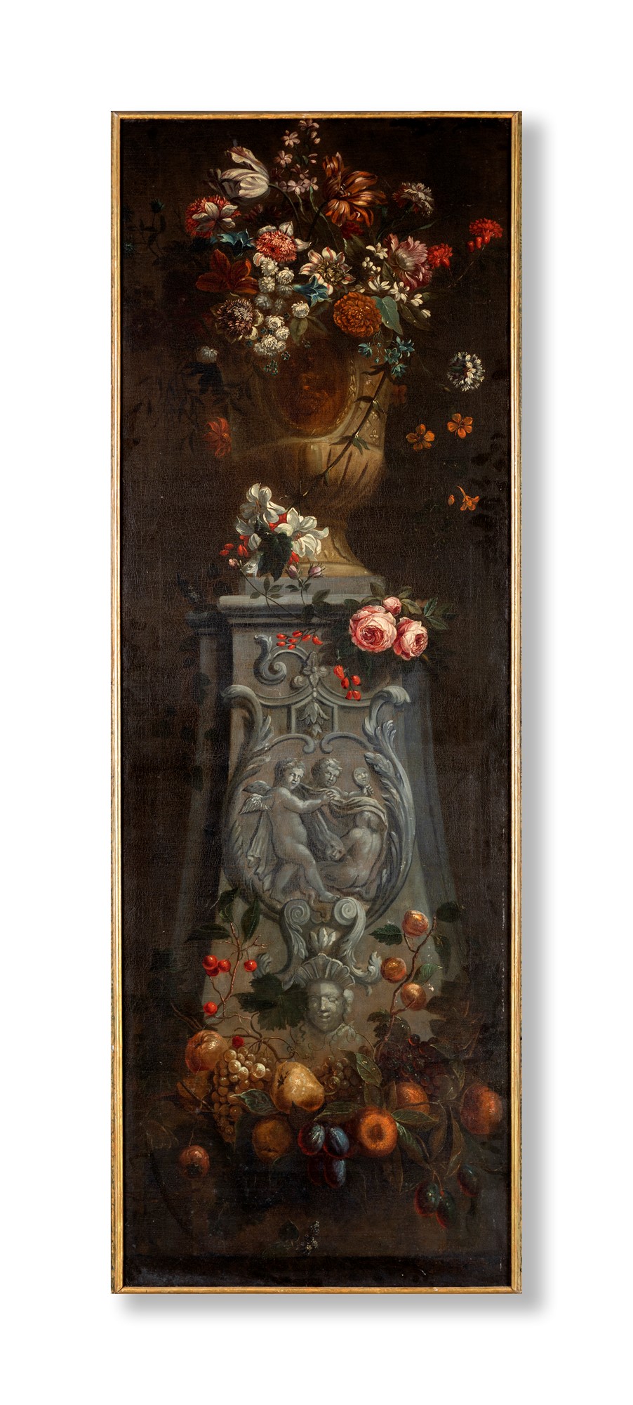 Pittore napoletano del XVII secolo - Natura morta di fiori con vaso classico e piedistallo scolpito - olio su tela - cm 235x80