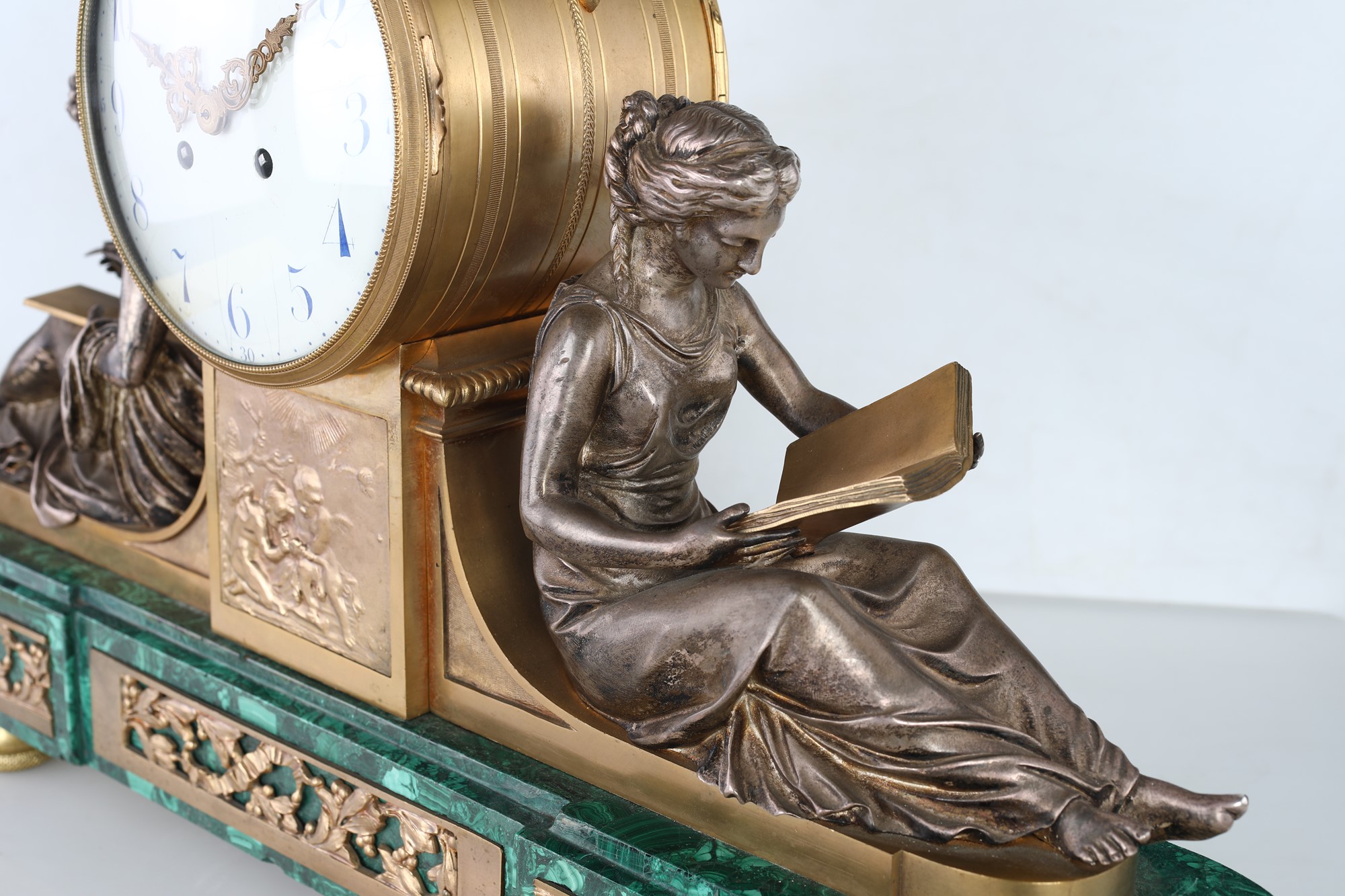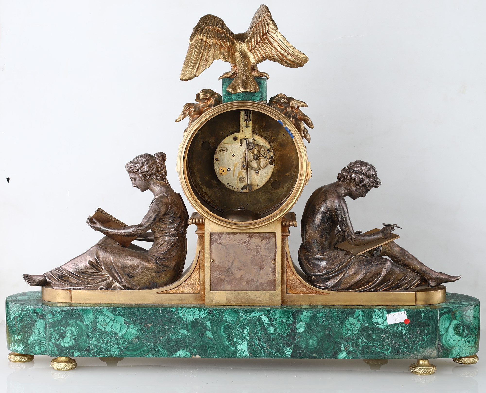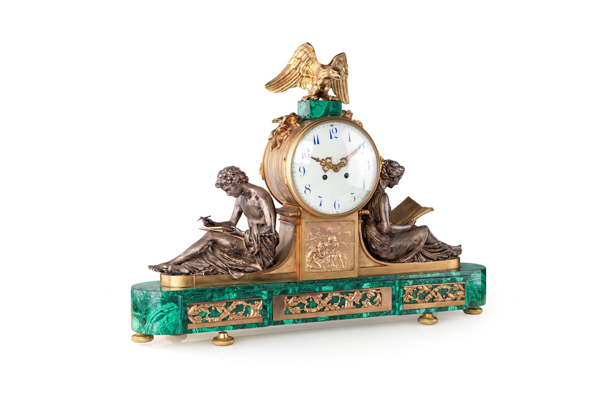 Grande orologio in bronzo e malachite, Francia, epoca Direttorio - caratterizzato da figure classiche brunite quali allegorie della scrittura e della lettura. Quadrante in smalto bianco a due fori di carica con fascia oraria a numeri arabi, sormontato da un rapace ad ali spiegate; base rettangolare su bassi piedi a trottola. Si veda per confronto: Giacomo Wannenes, Le più belle pendole francesi da Luigi XIV all'Impero, Leonardo Editore, Milano 1991, pagg. 152-153 - cm 51x70x13