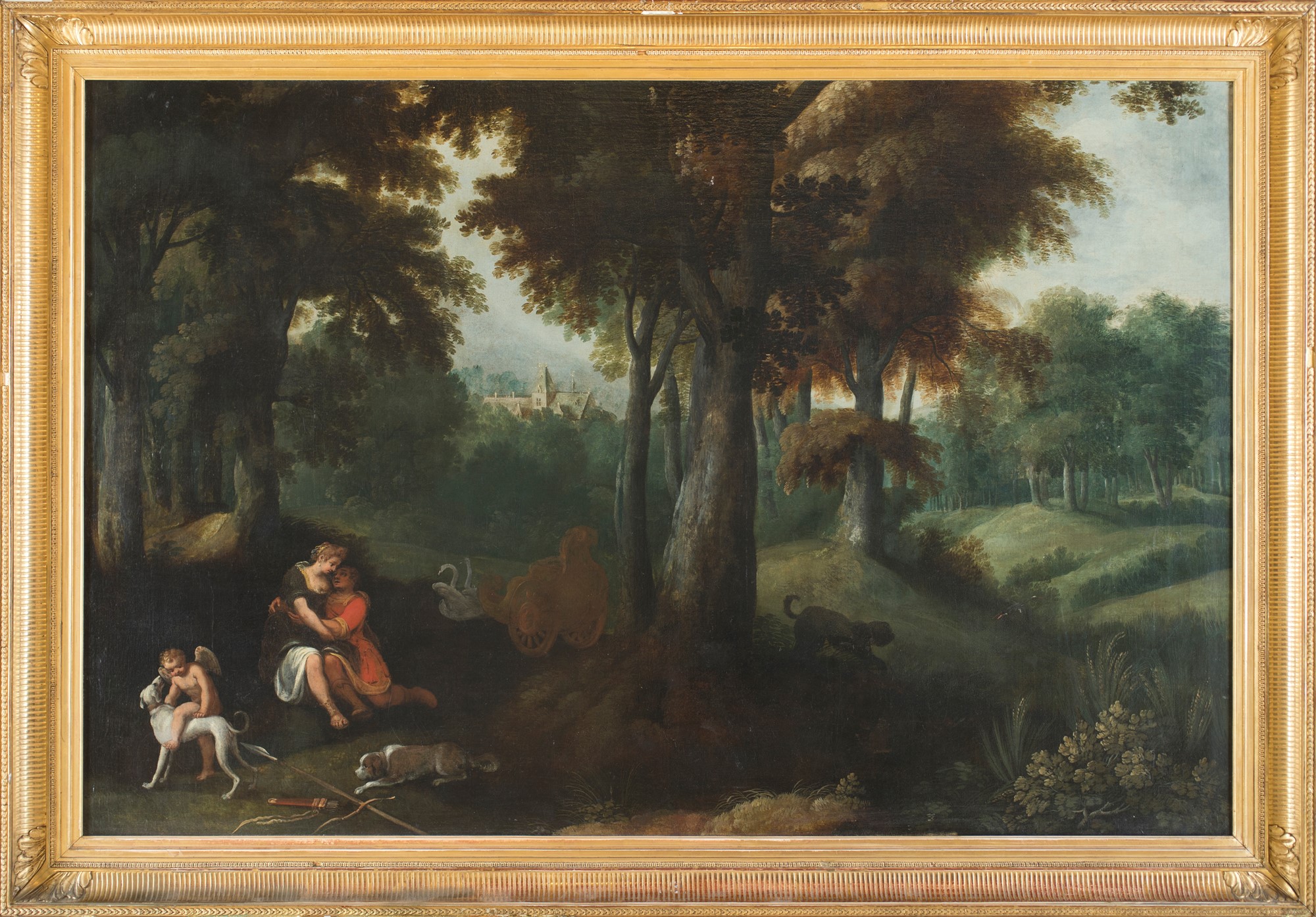 Lucas van Uden - Venere e Adone nel paesaggio con figura di Cupido e animali - Autentica del prof. Didier Bodart in data 17/11/2010 - olio su tela - cm 98x148