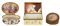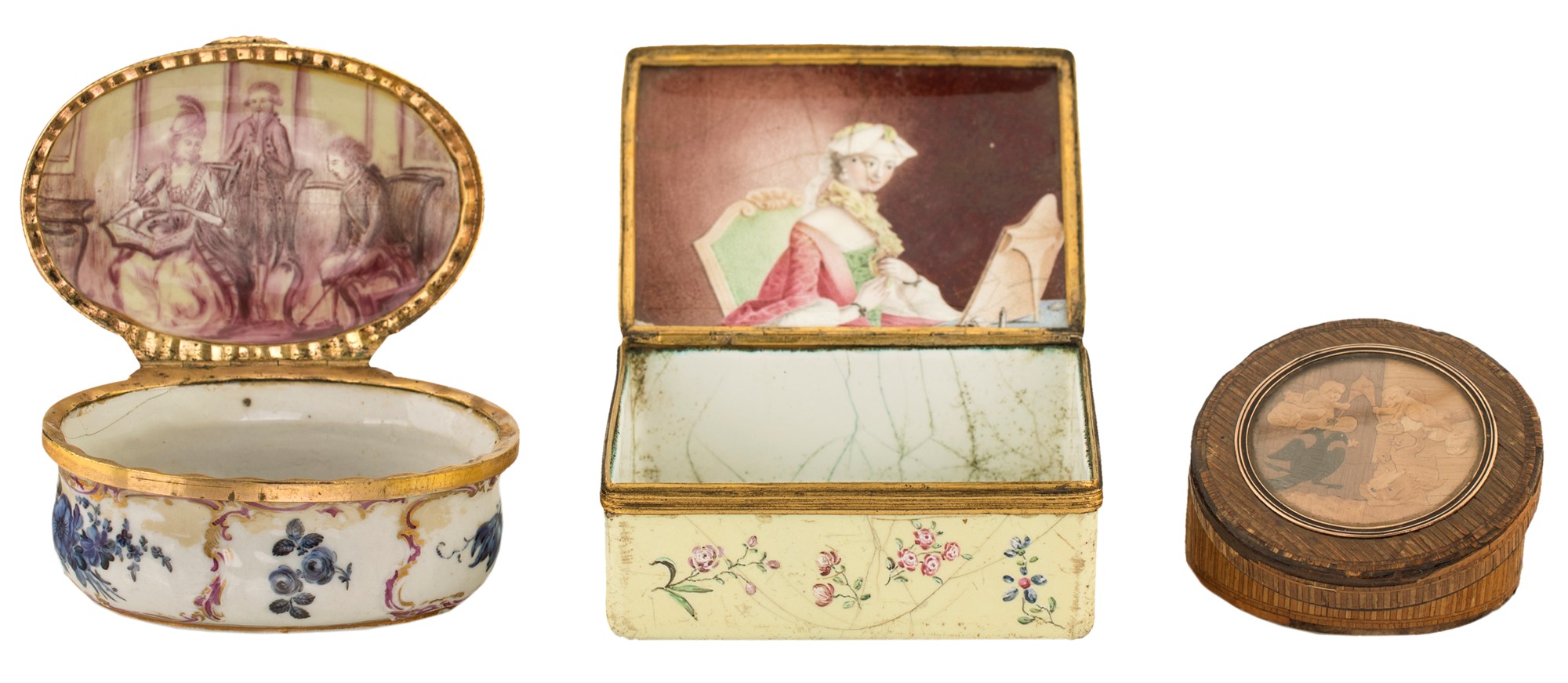 Tre piccole scatole diverse, fine XVIII/inizio XIX secolo - la prima in rame smaltato di forma rettangolare interamente decorata da piccoli fiori sparsi su fondo giallo; coperchio incernierato decorato al verso da una figura femminile ritratta allo specchio; la seconda in porcellana di forma ovale decorata da composizioni floreali in blu entro volute amaranto; coperchio incernierato trattenuto da montatura in rame dorato, decorato al verso da tre figure in abiti settecenteschi ritratte in un interno. La terza in legno, più rara, di forma circolare interamente rivestita da sottilissime fibre vegetali, con coperchio caratterizzato da un intreccio in bassorilievo a raffigurare emblemi araldici. - cm 3,5x8x6,2 - cm 4x8x5,8 - cm 2,7x5,8