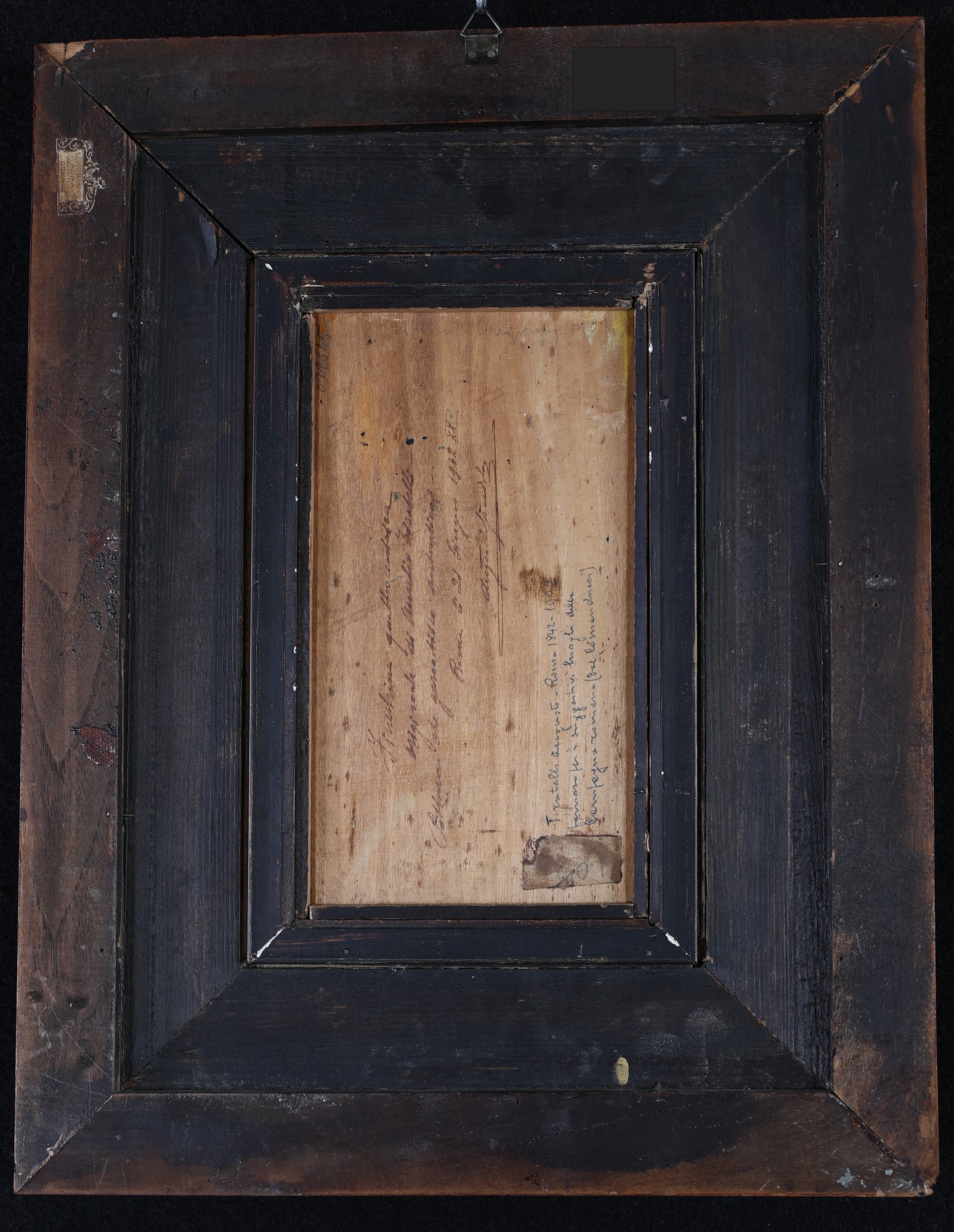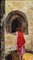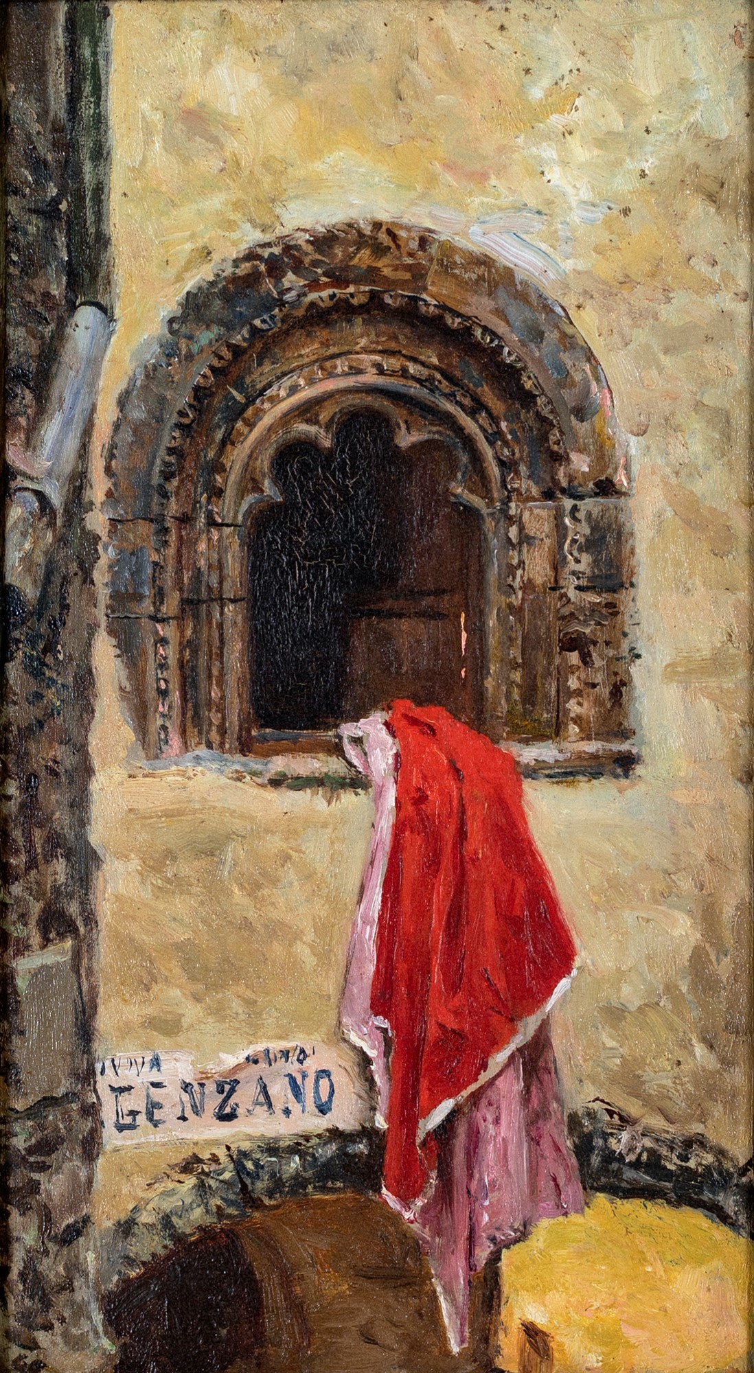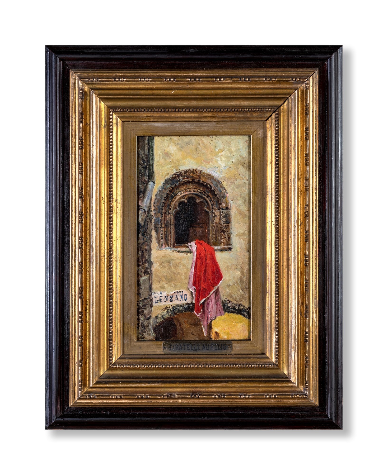 Aurelio Tiratelli - Il drappo rosso - Al verso autentica manoscritta in data 1942 XX dell'Era Fascista - olio su tavoletta - cm 24x14