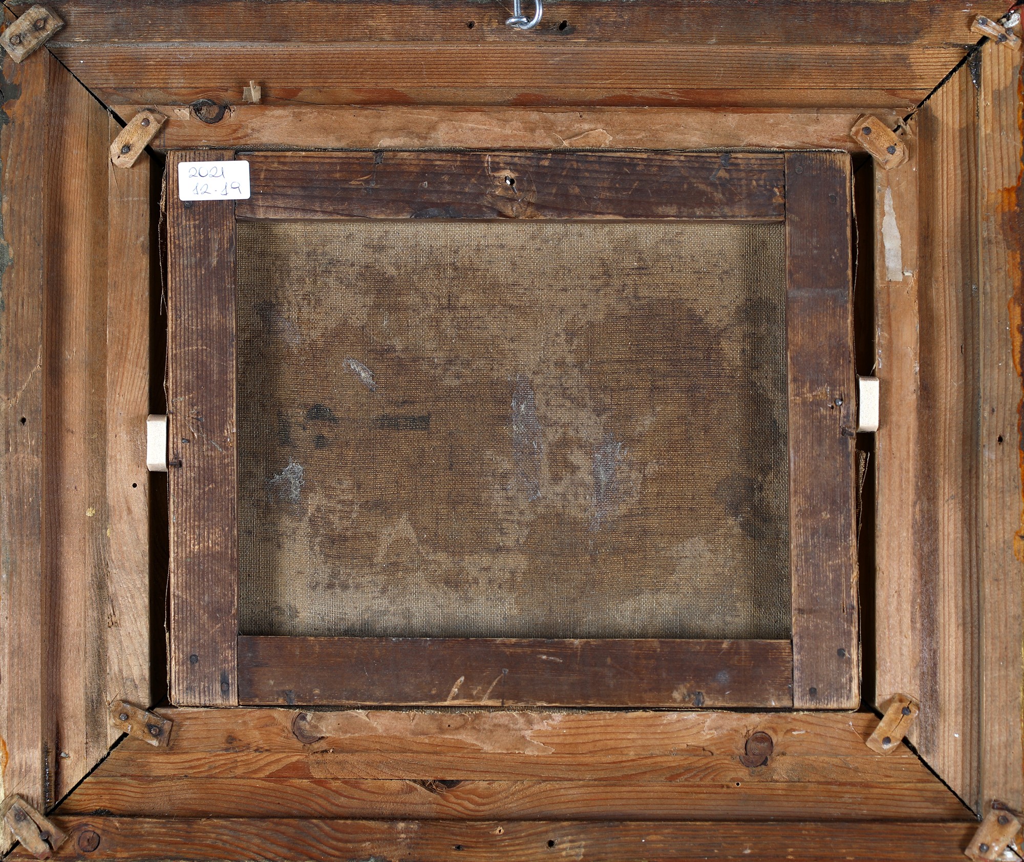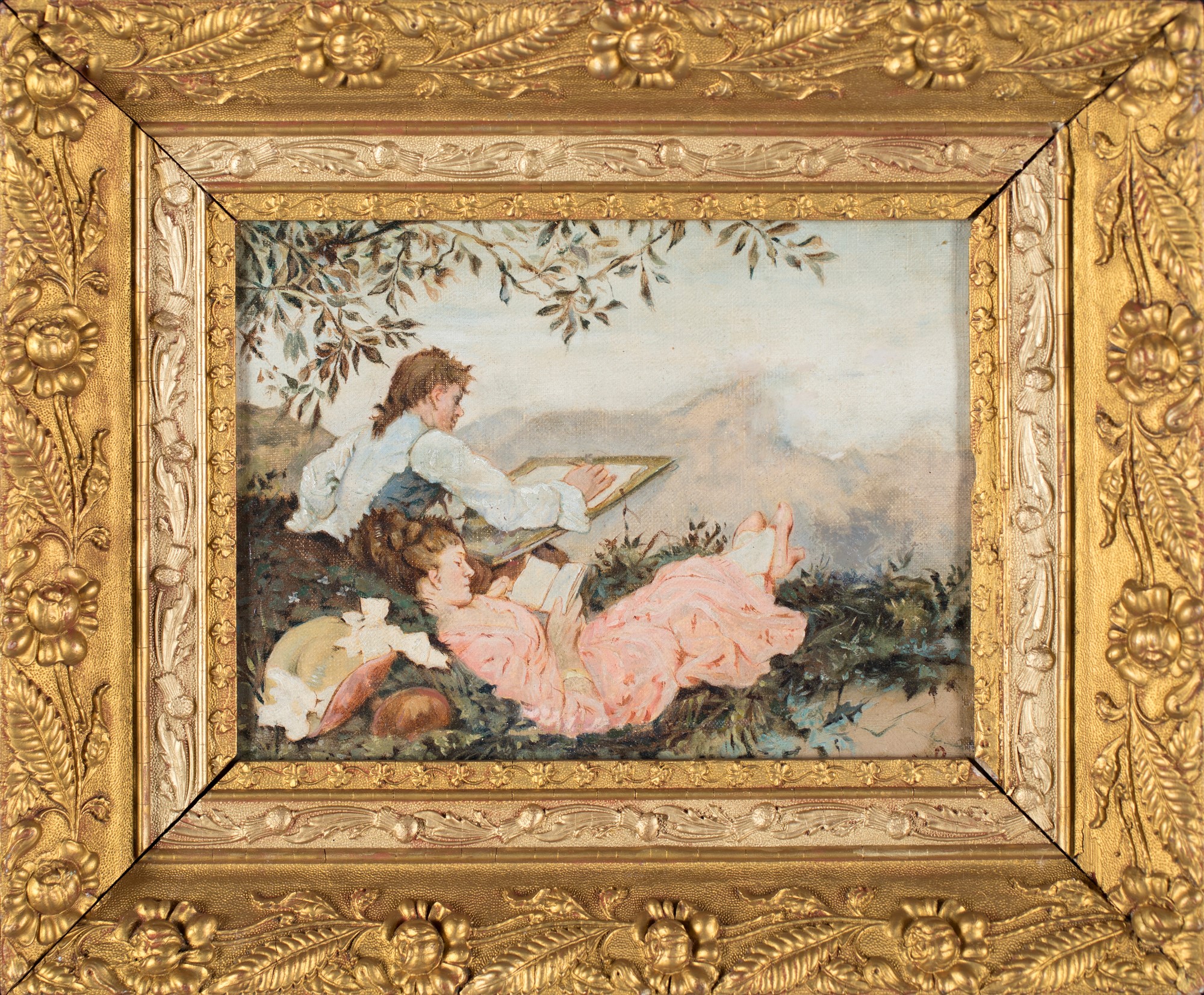 Anonimo del XIX secolo - Lettura e pittura "en plein air" - Siglato in basso a destra - olio su tela - cm 21,5x27