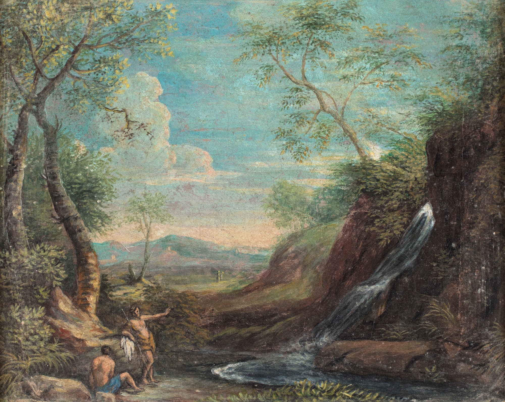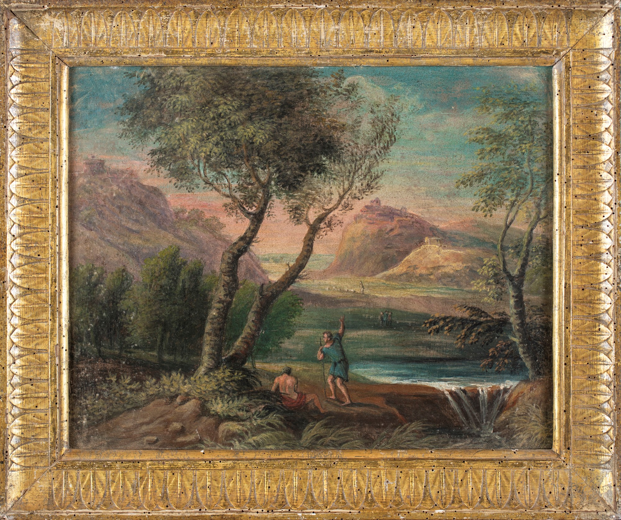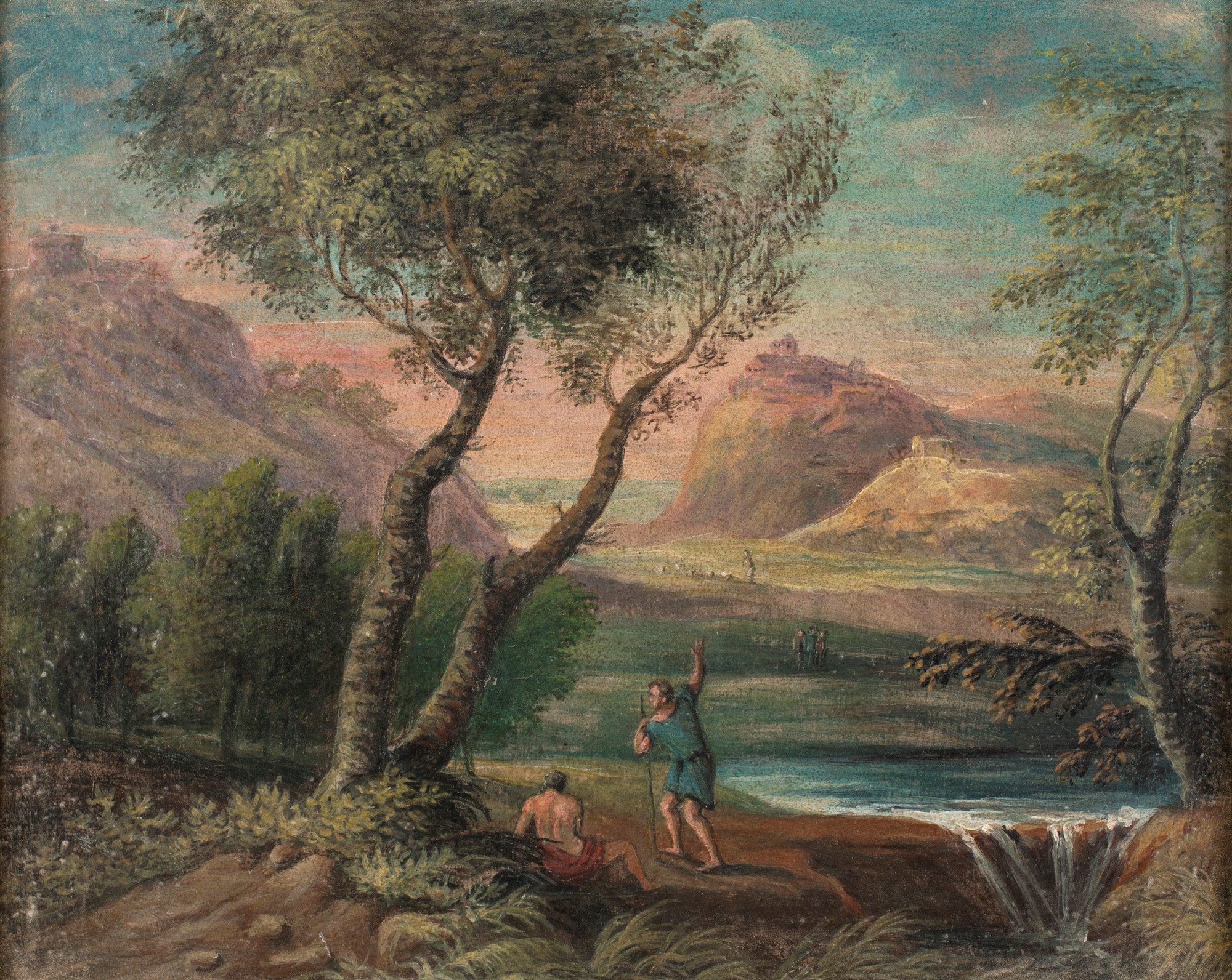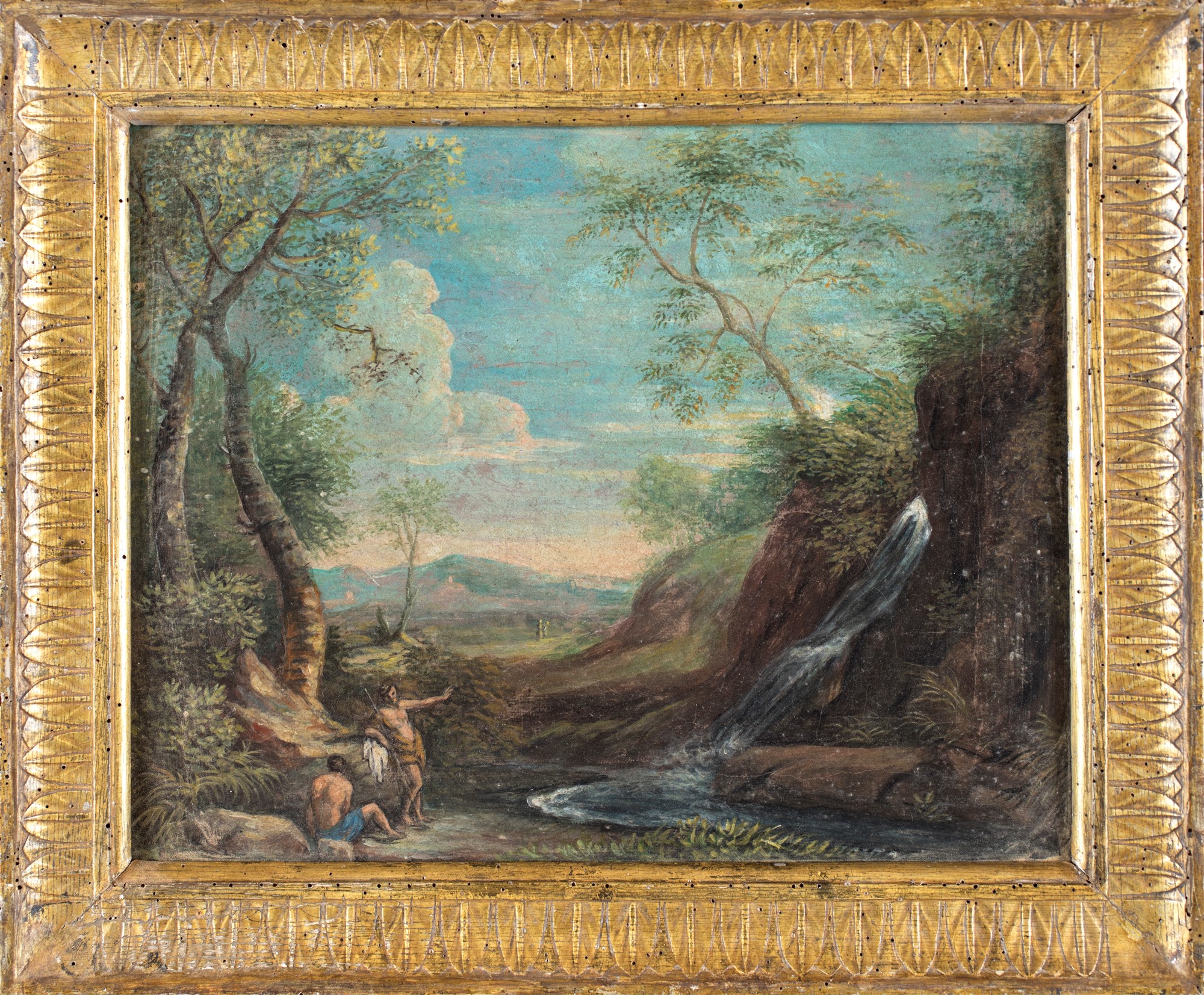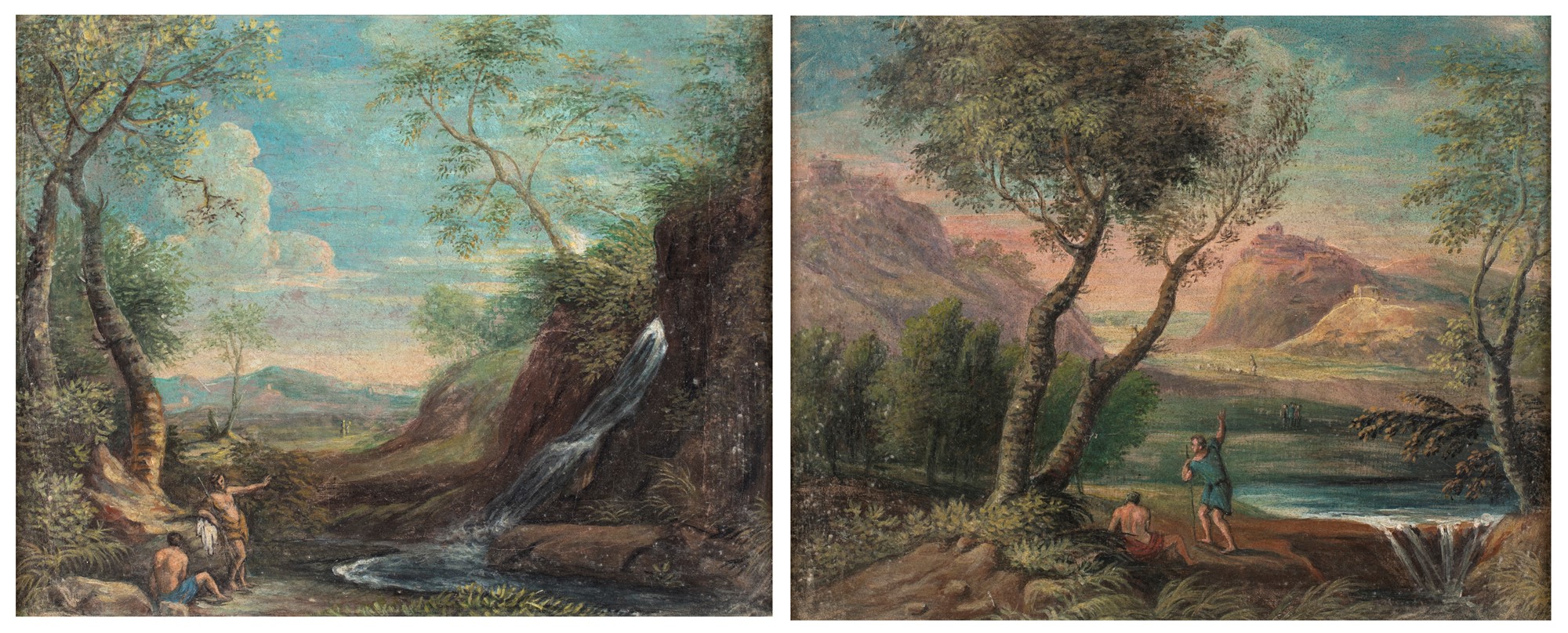 Scuola Romana del XVIII secolo - a) Paesaggio fluviale con cascatella e figure b) Paesaggio fluviale con figure e borgo in lontananza - coppia di olii su tela - cm 38x47