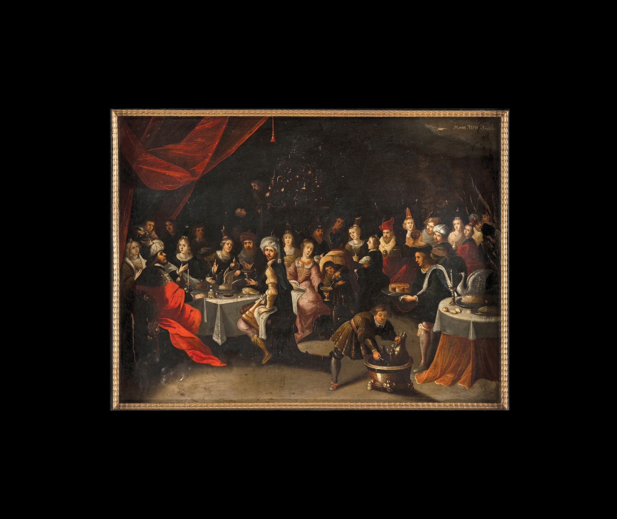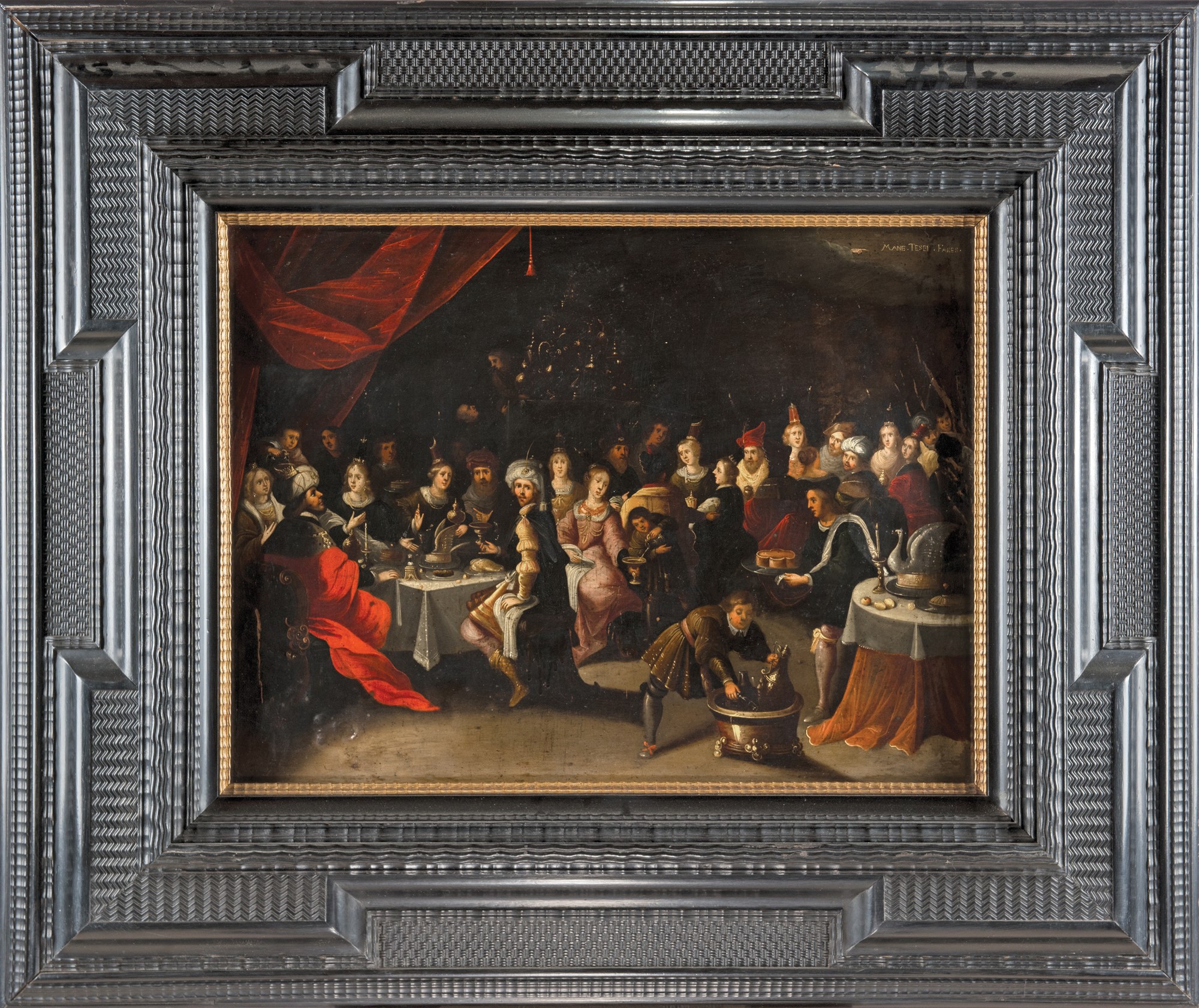 Ambrosius Francken I detto il Vecchio) - Il banchetto di Baldassarre - olio su rame - cm 53x70