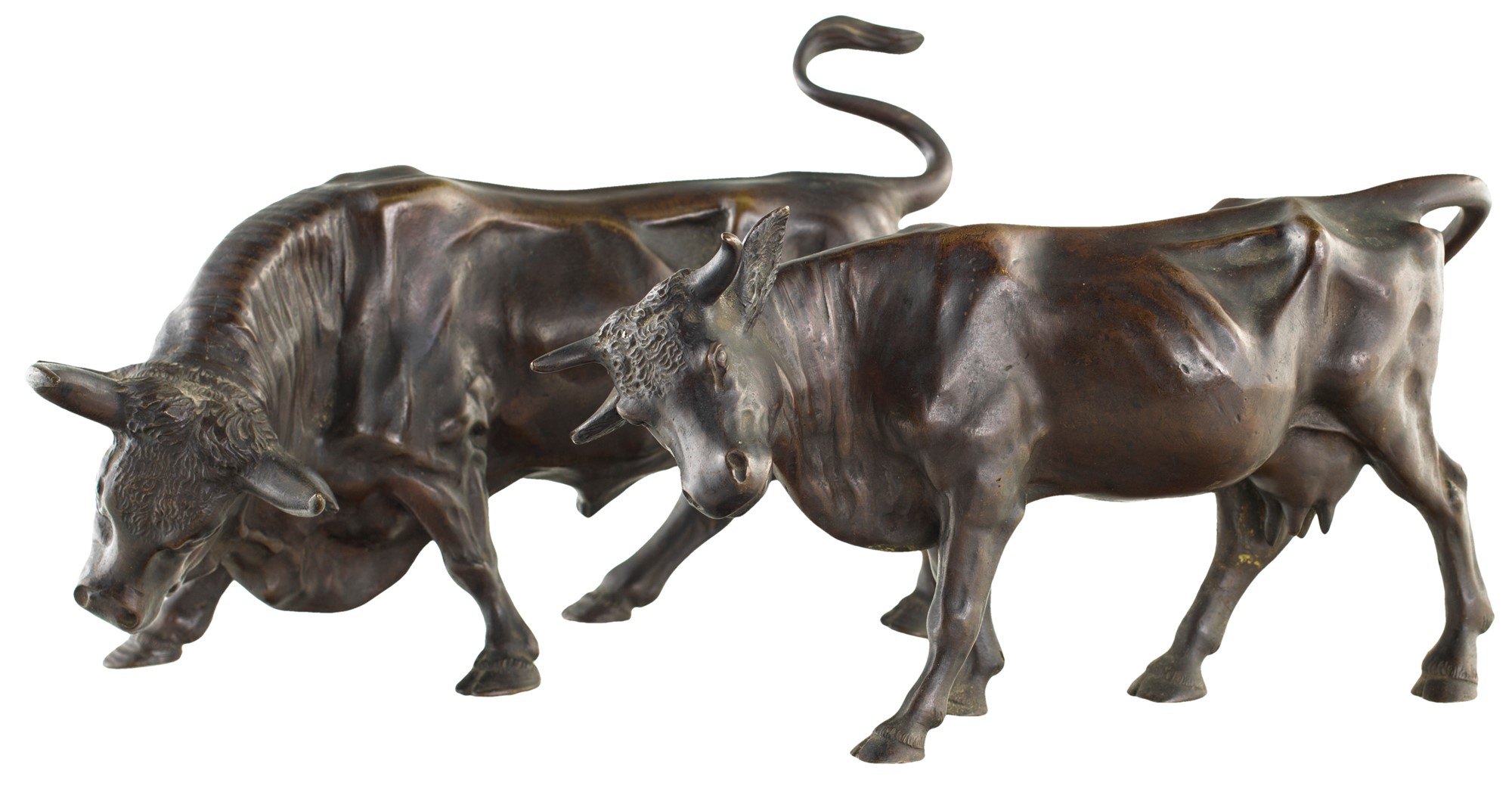 Antonio Pandiani - A) Toro b) Giovenca - Firmate sotto ad uno zoccolo: Pandiani Milano - coppia di sculture in bronzo brunito - cm 19x33x13 e cm 15x28x8 rispettivamente
