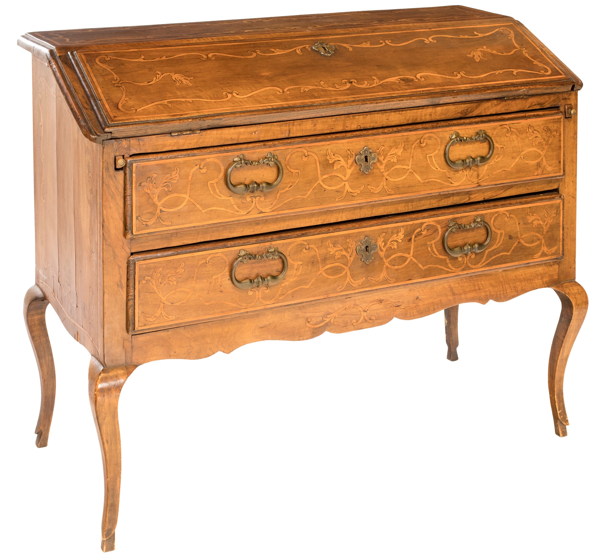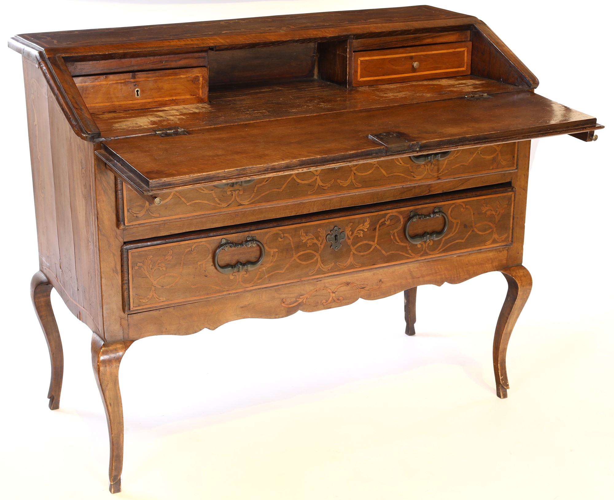 Ribalta in legno di noce, Piemonte XVIII secolo - con filettature intarsiate in legno di frutto ad andamento lineare poste a cornice di tarsie sagomate ad andamento mistilineo terminanti con motivi vegetali; poggiante su gambe mosse, reca due cassetti frontali con maniglie in bronzo e due tiretti all'interno della ribalta - cm 94,5x116x48