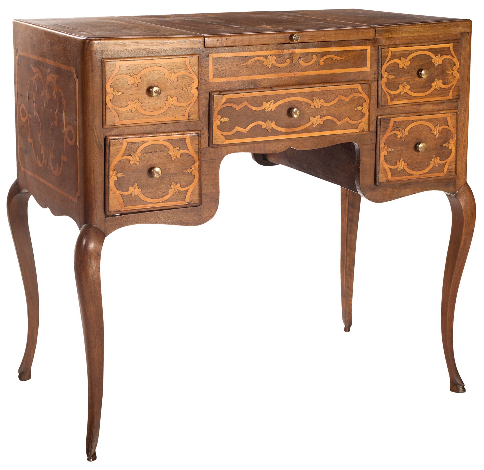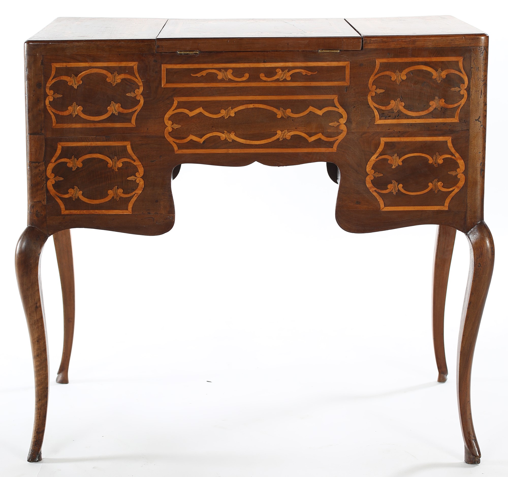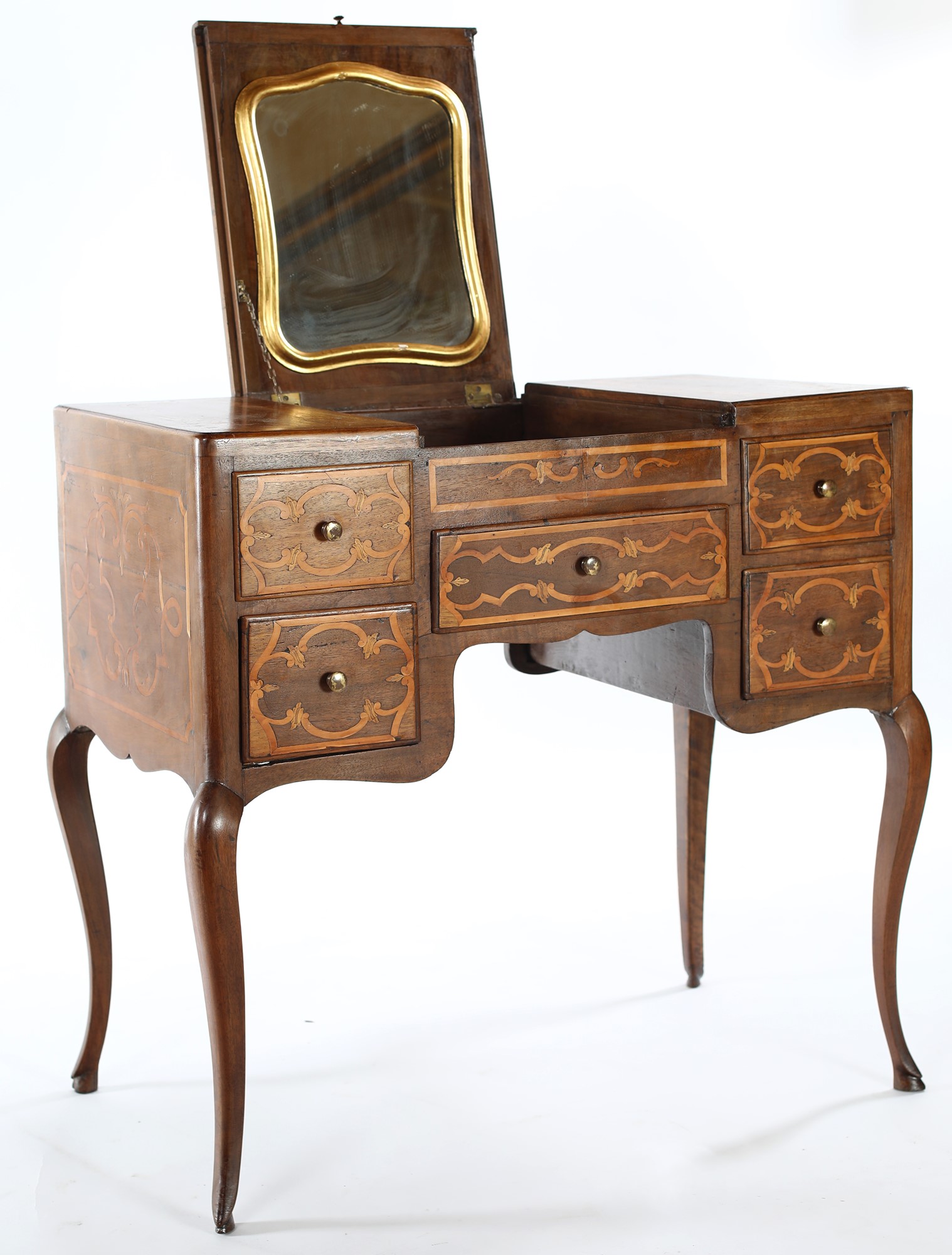 Toletta da centro in noce, Piemonte, XIX secolo - di gusto settecentesco, intarsiata in legno di frutto a volute poste a cornice delle varie partizioni. Sorretta da gambe sagomate, reca cassetti frontali e piano con sezione centrale apribile con specchio al verso racchiuso da cornice in lego dorato - cm 79x82x56