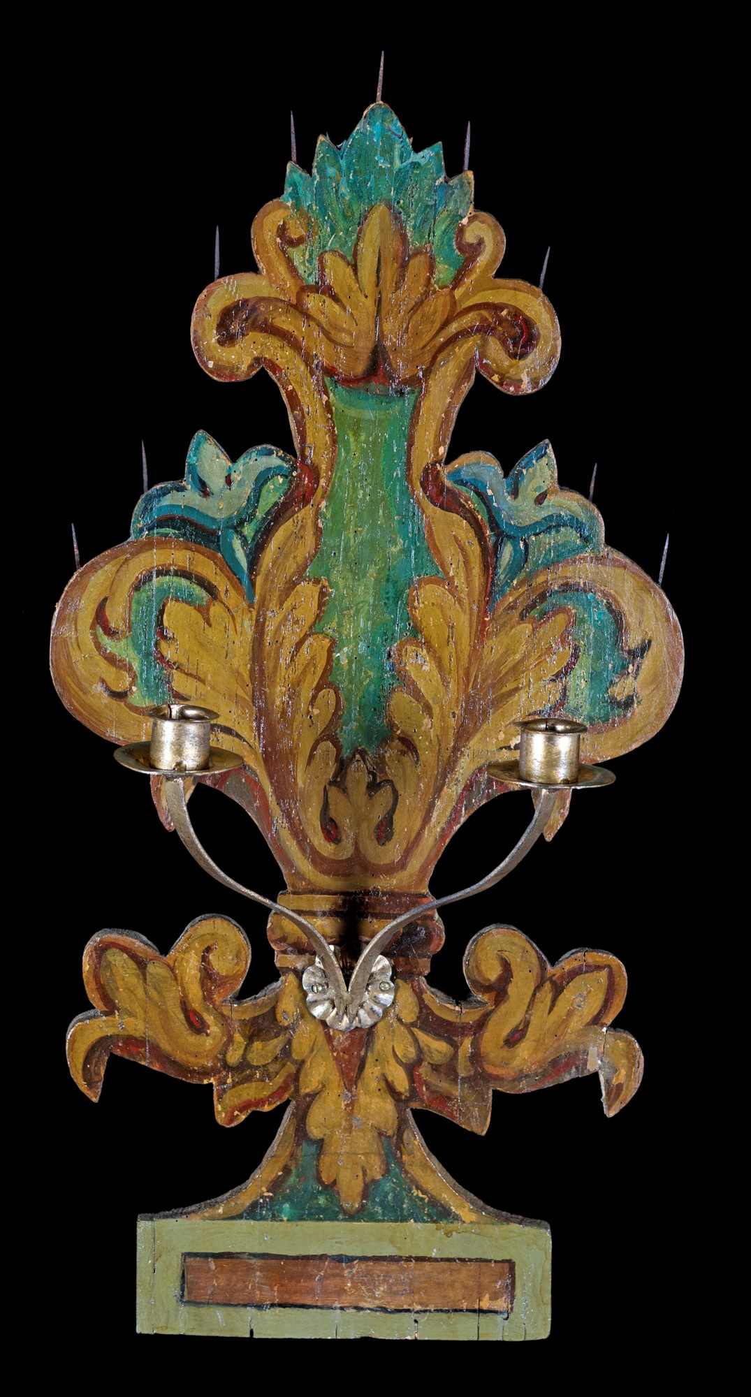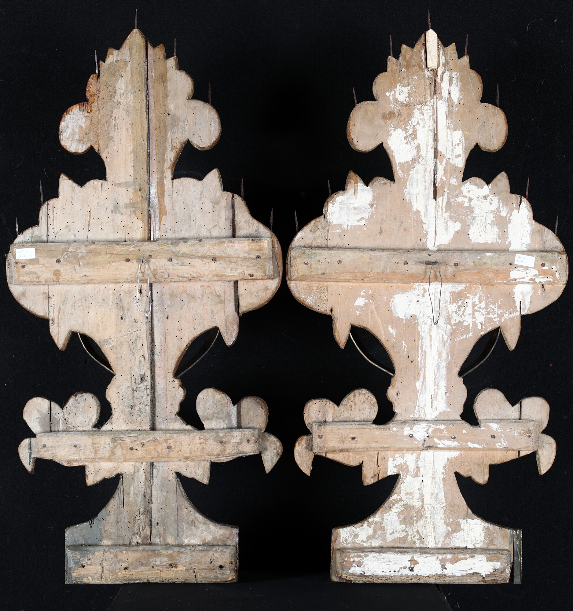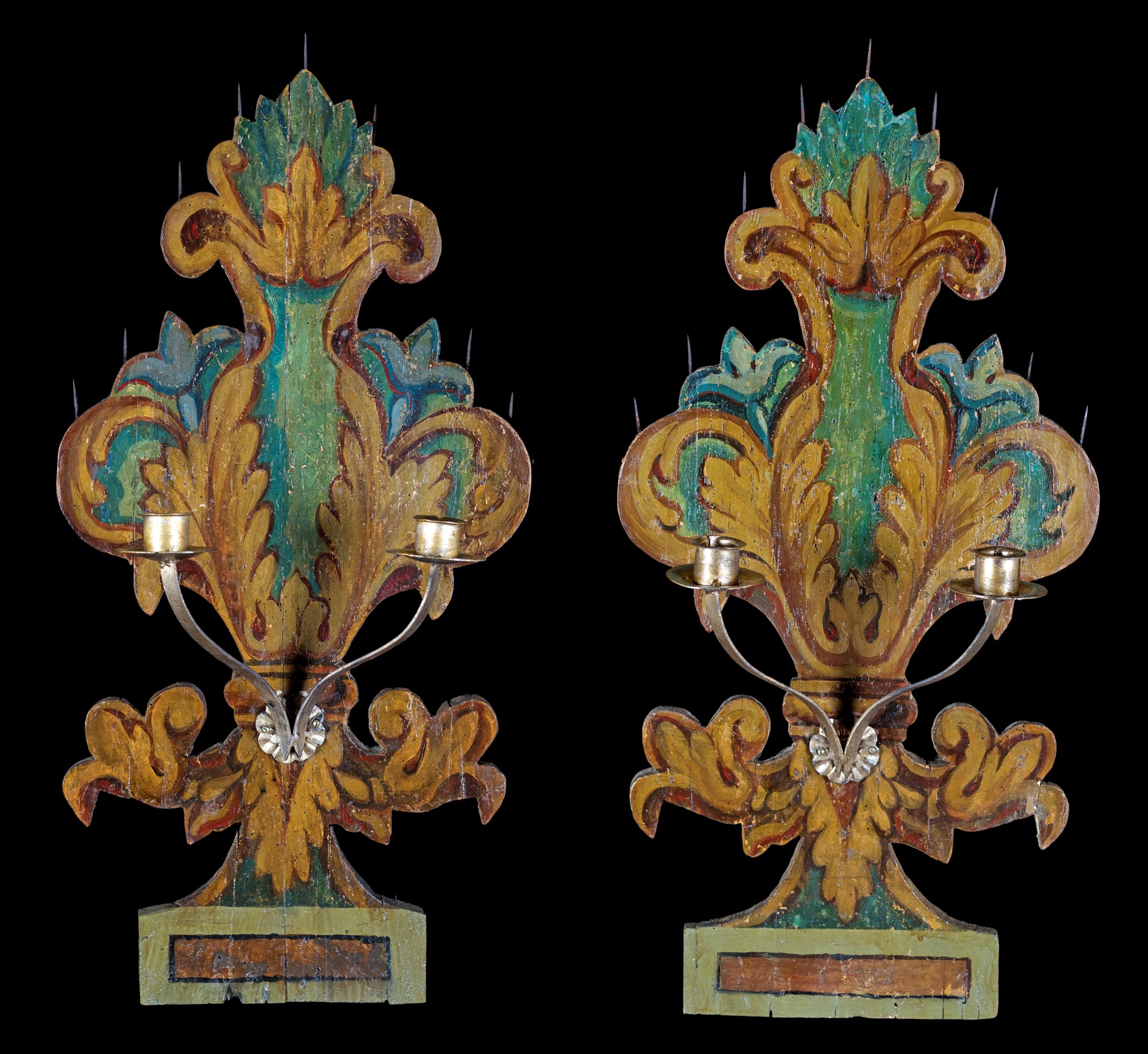 Coppia di porta palme in legno dipinto, XVIII secolo - con due braccetti reggicandela e undici portaceri simmetricamente disposti lungo il perimetro superiore - cm 80X40