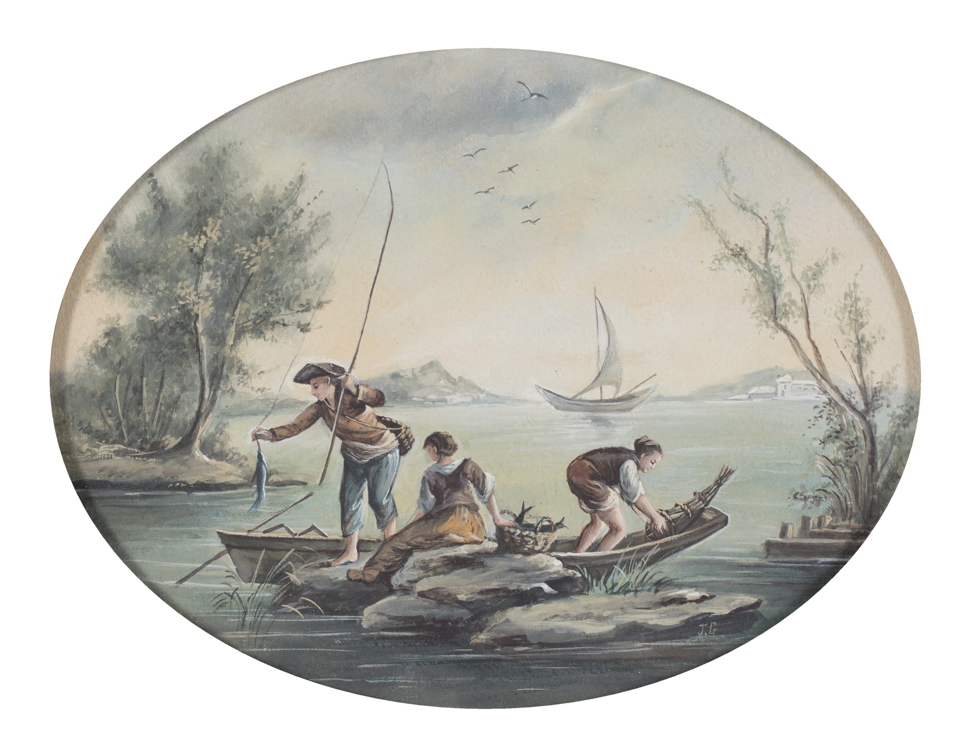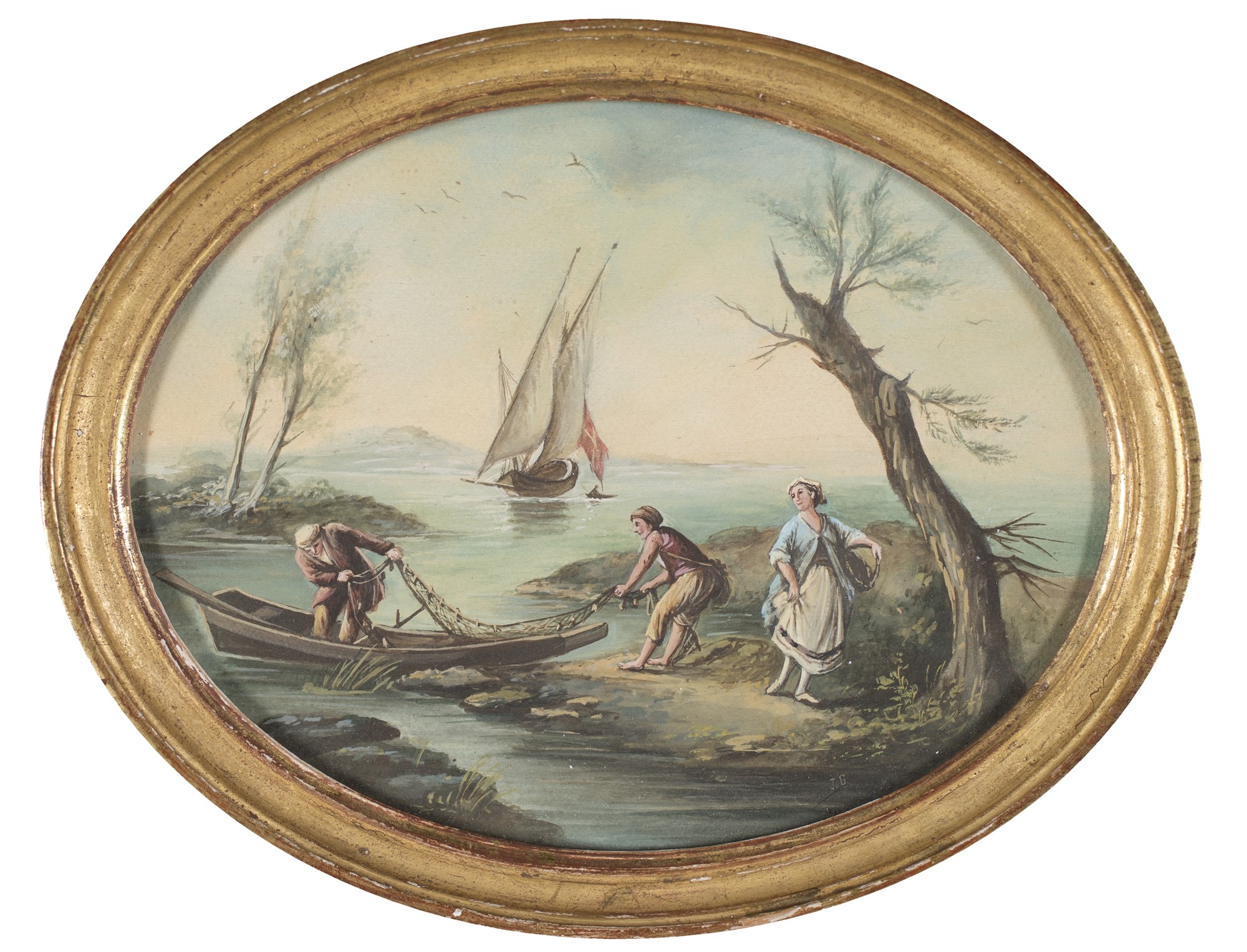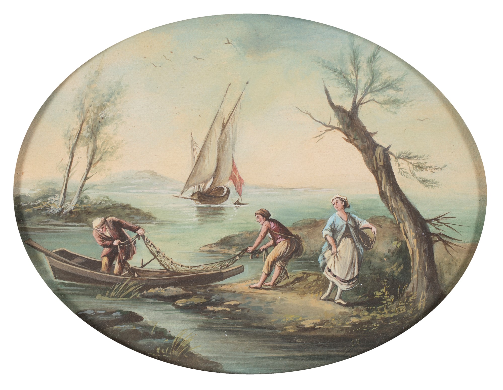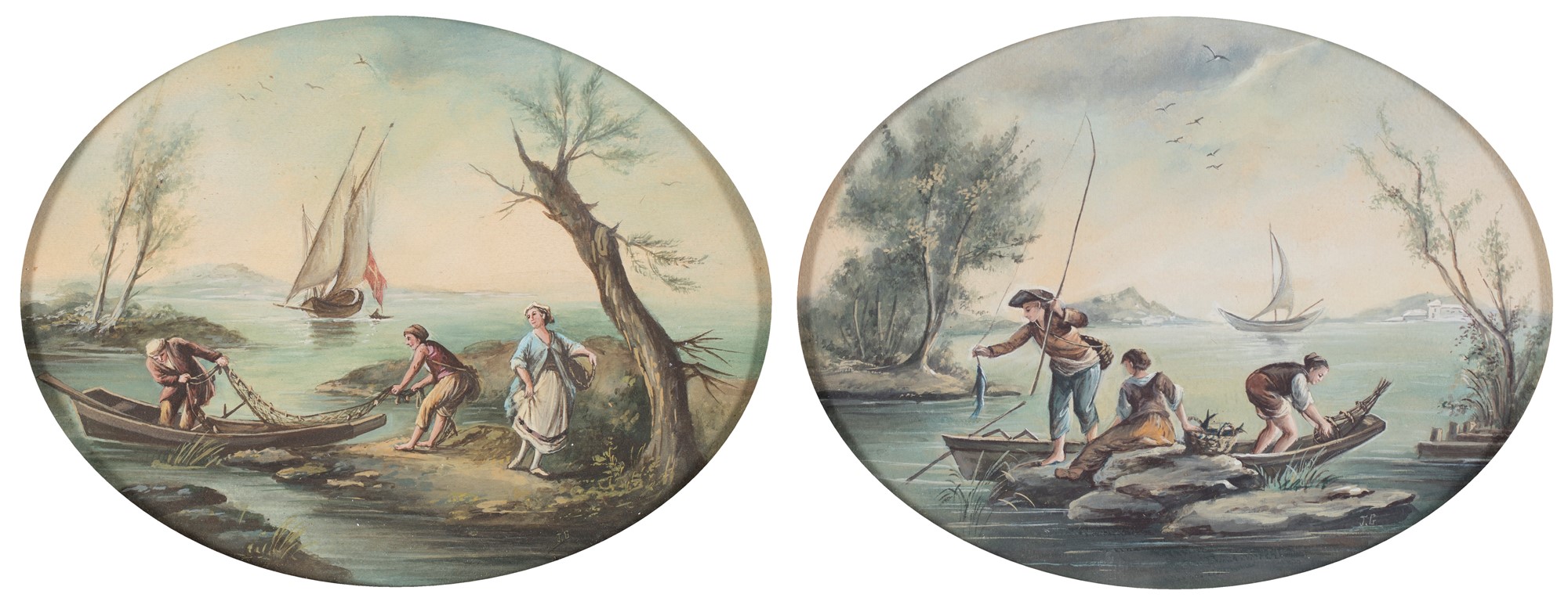 Scuola Veneta del XVIII secolo - a) Pescatori sul lago b) La piegatura delle reti - Siglati in basso a destra: J.G. - coppia di tempere ovali - cm 15x20