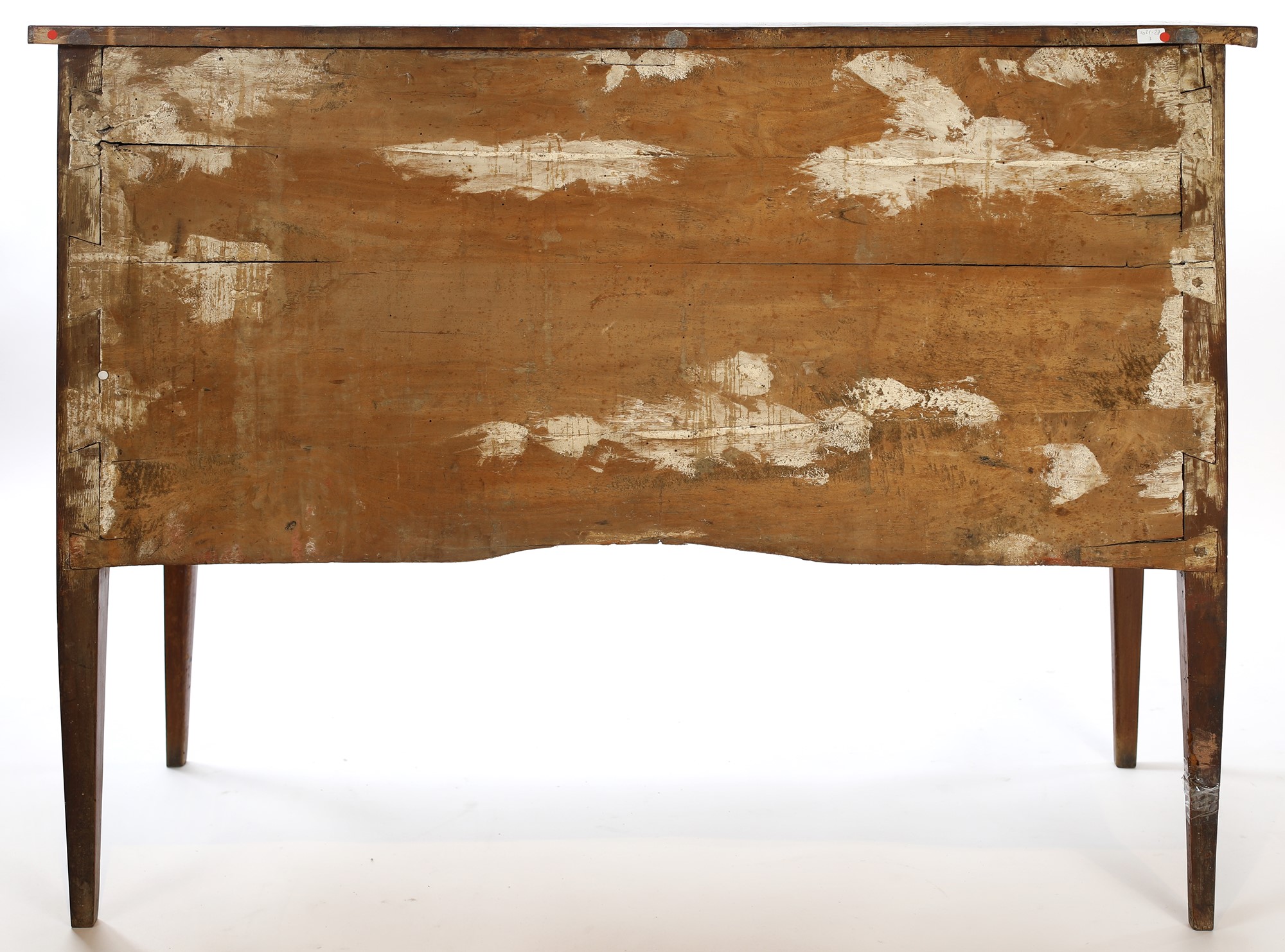 Cassettone lastronato noce, fine del XVIII secolo - con filettature intarsiate in legno di frutto percorse da unghiature brunite disposte in sequenza; due cassetti frontali, piedi rastremati - cm 94x124,5x55,5