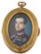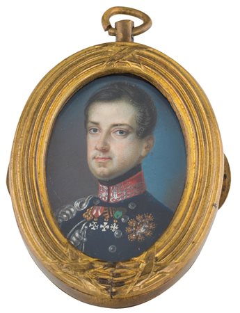 Miniatura su avorio, prima metà del XIX secolo - raffigurante Carlo Alberto di Savoia; entro medaglione in bronzo dorato con profilo scannellato come verghe legate alle estremità da nastri incrociati - cm 4,5x3,3 ca. - con la cornice: cm 7x4,8