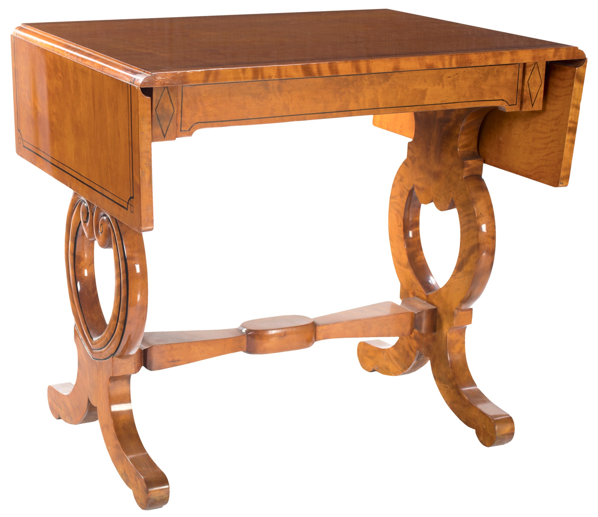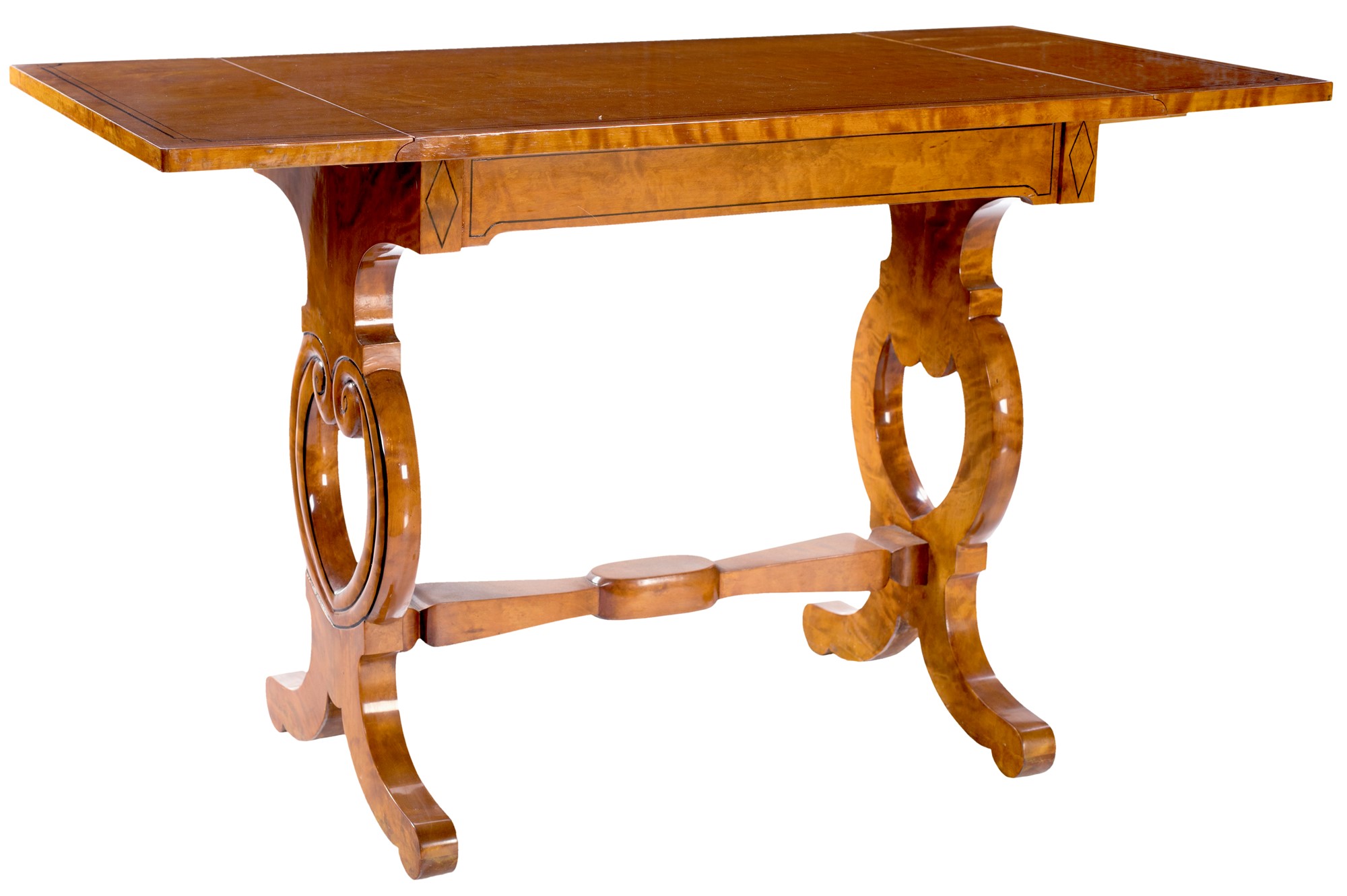 Scrittoio a bandelle d'epoca Carlo X in betulla - con piano rettangolare racchiuso da doppie filettature delineate; fascia comprendente un cassetto, montanti costituiti da volute affrontate riuniti da traversa, piedi a sciabola con estremità a ricciolo - cm 78x86x62