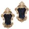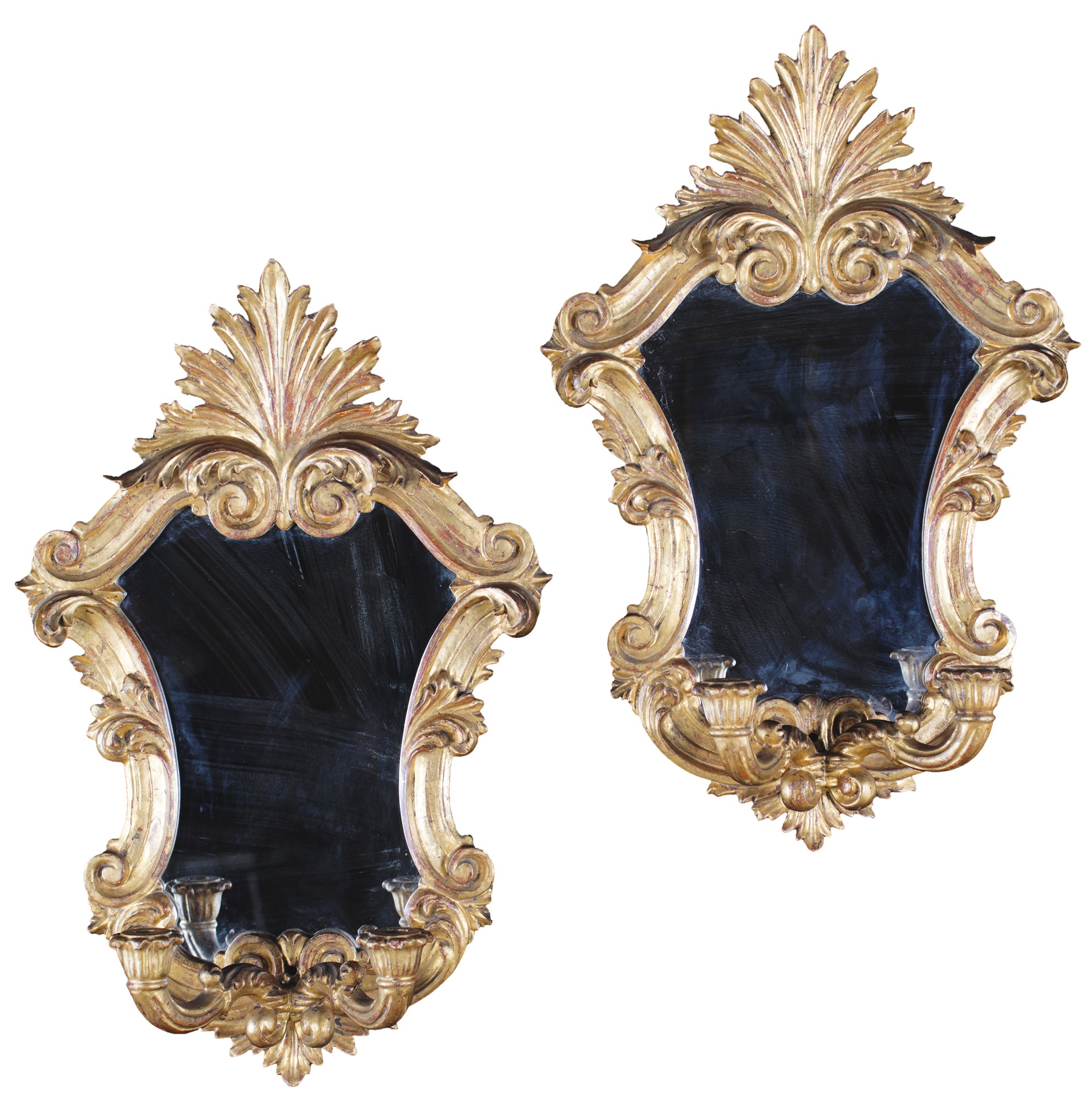 Coppia di antiche specchierine in legno dorato - con cornice sagomata sormontata da fastigio; alla base due braccetti reggicandela - cm 54x36