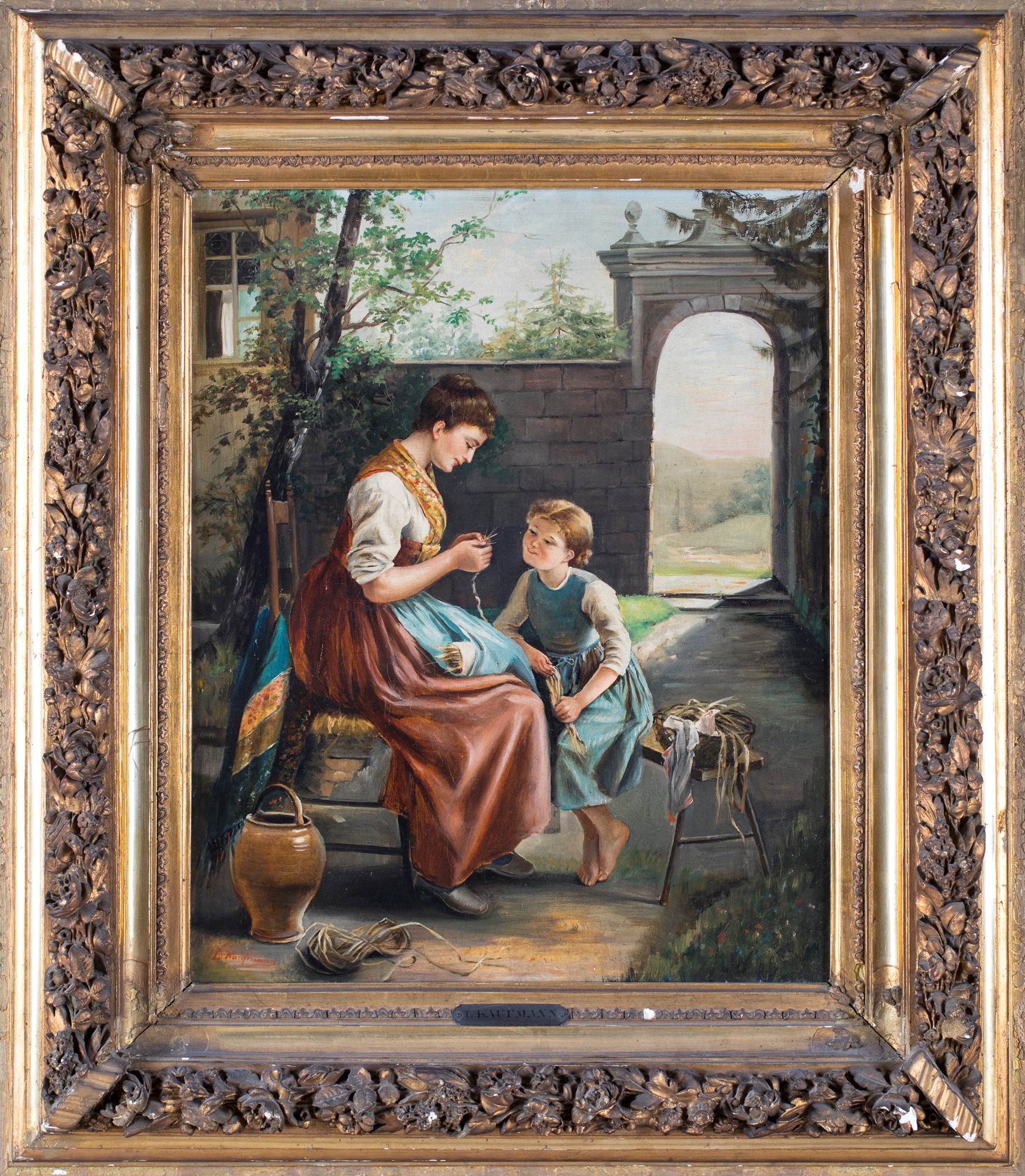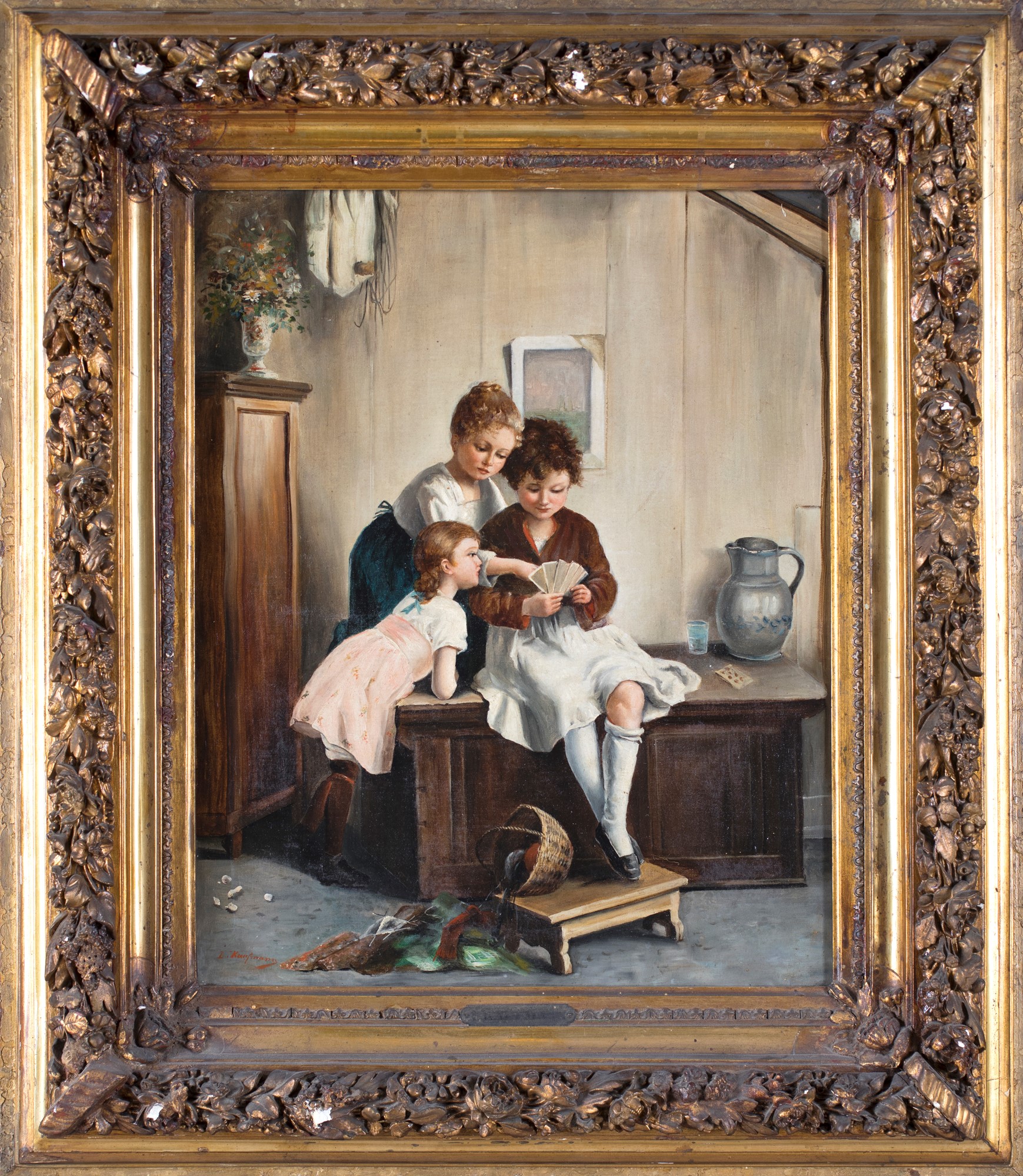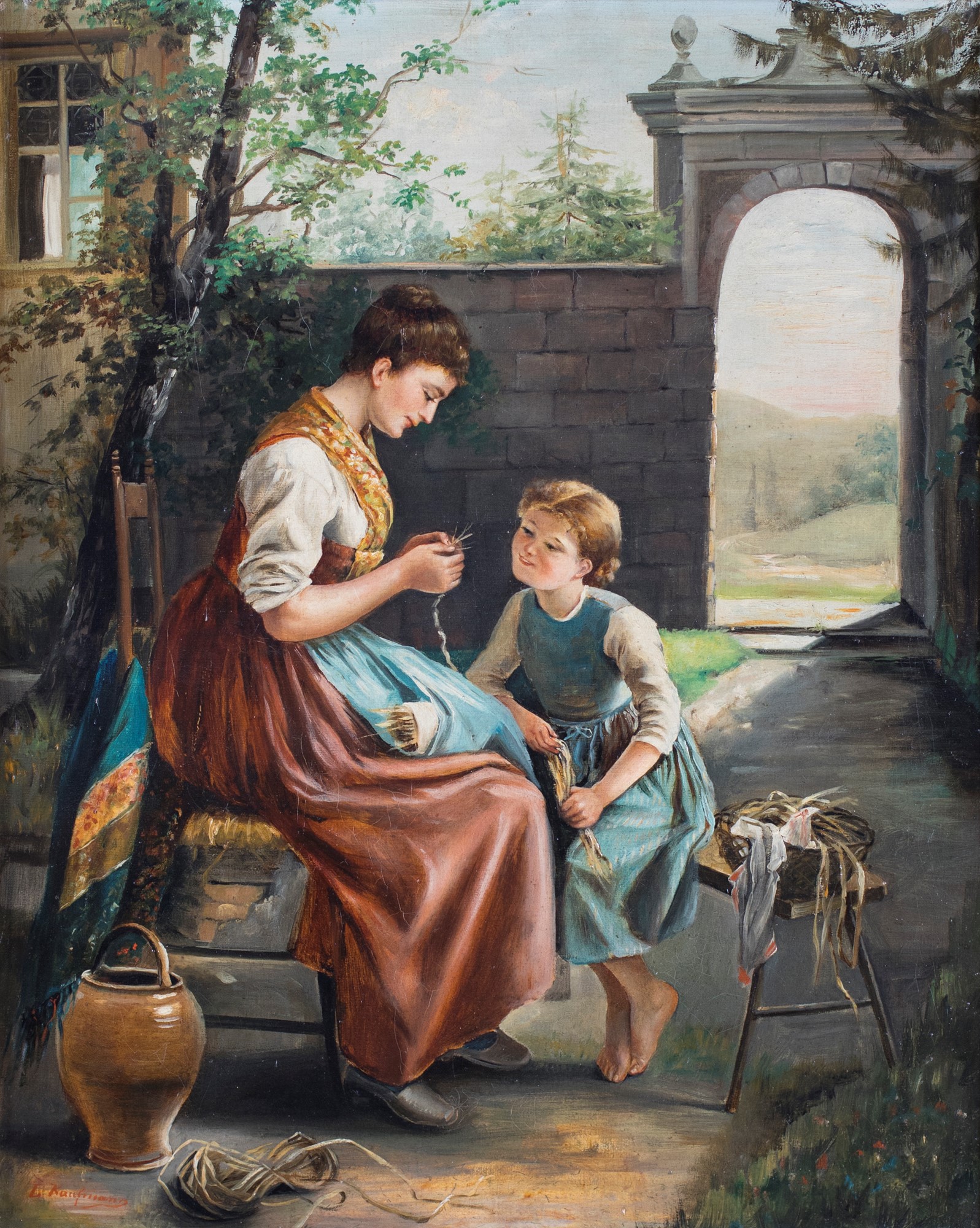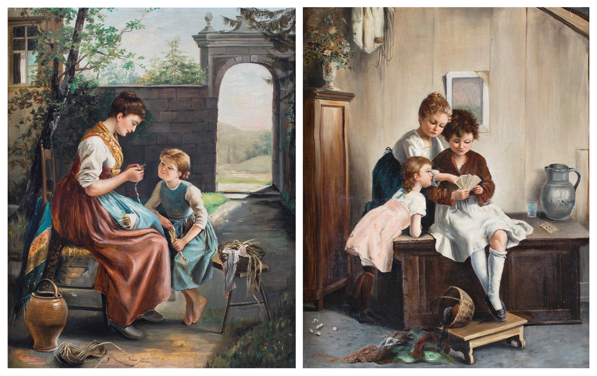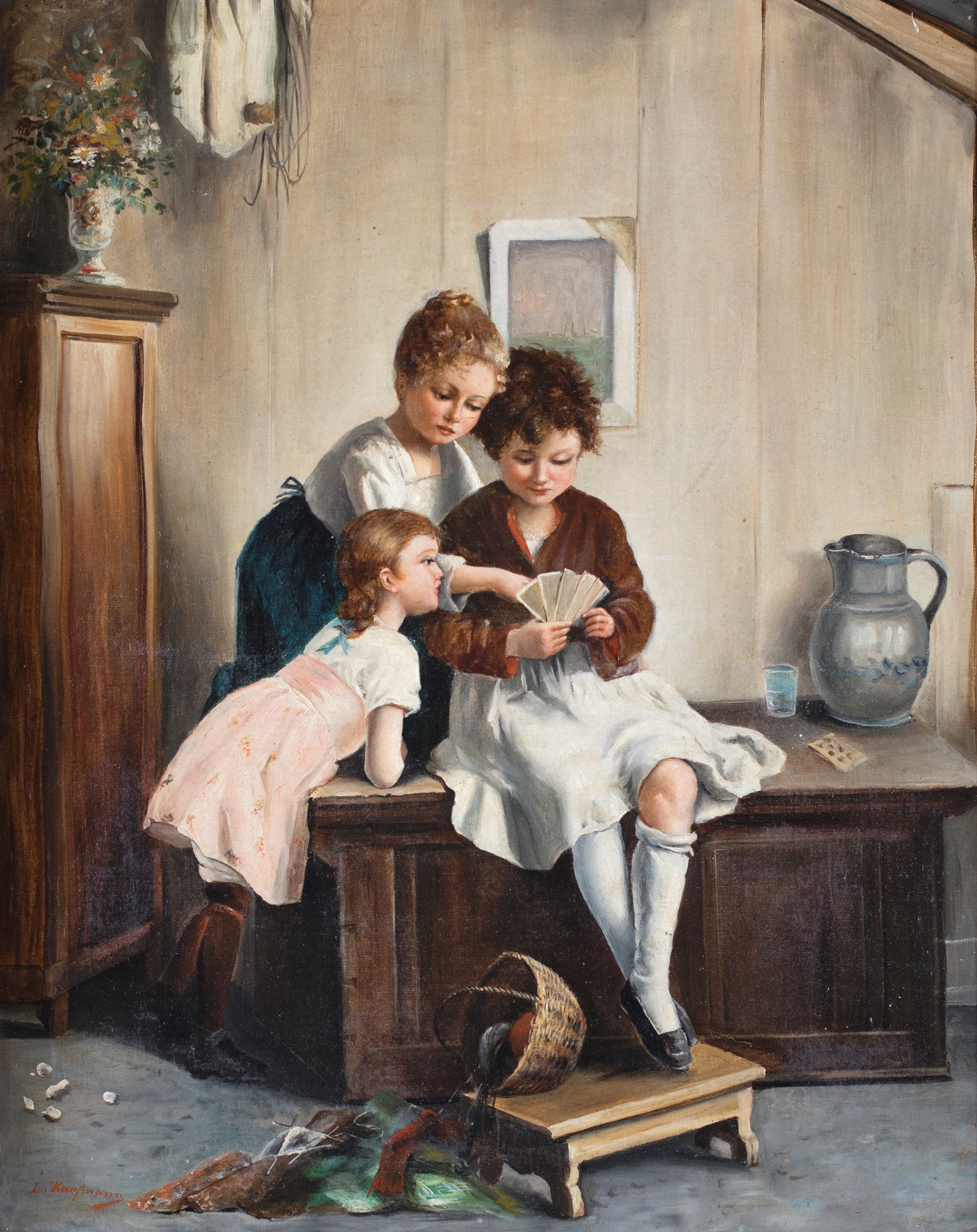 Leon Kauffmann - a) L'intreccio della paglia b) Giochi di carte - Firmati in basso a sinistra: L. Kauffmann - coppia di olii su tela - cm 68x55