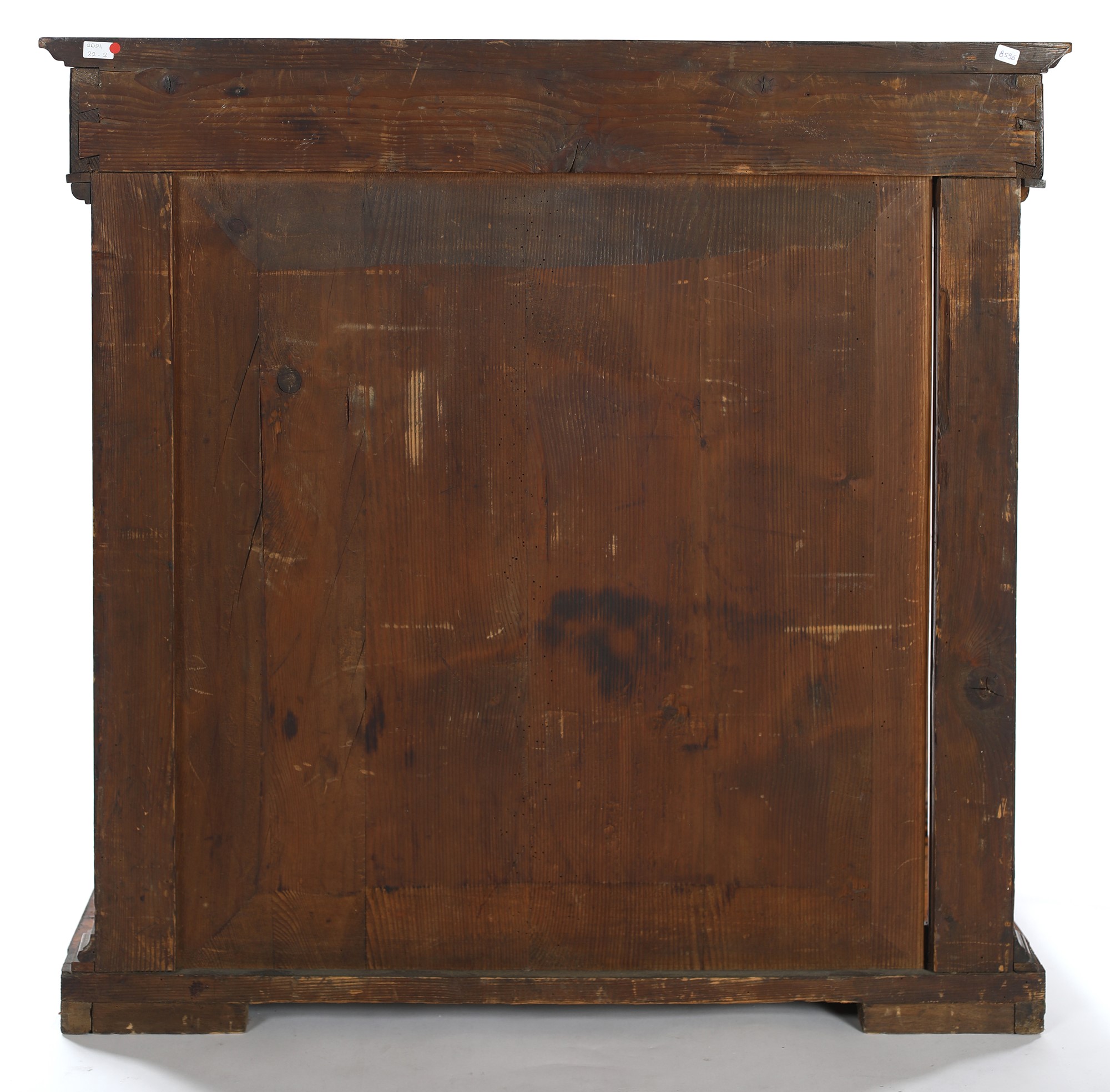 Andrea Appiani il Giovane - Console in ciliegio, Lucca, fine XVIII/inizio XIX secolo - con elegante decorazione pirografata lungo la fascia centrata da un medaglione con un putto con agnello tra candelabre e al centro del pannello posteriore dominato da una panoplia con faretra circondata da elementi naturalistici idealmente sorretti da un fiocco. Piano lievemente sporgente sottolineato da modanatura, montanti anteriori a guisa di colonna su pedana rettangolare - cm 93x95x48