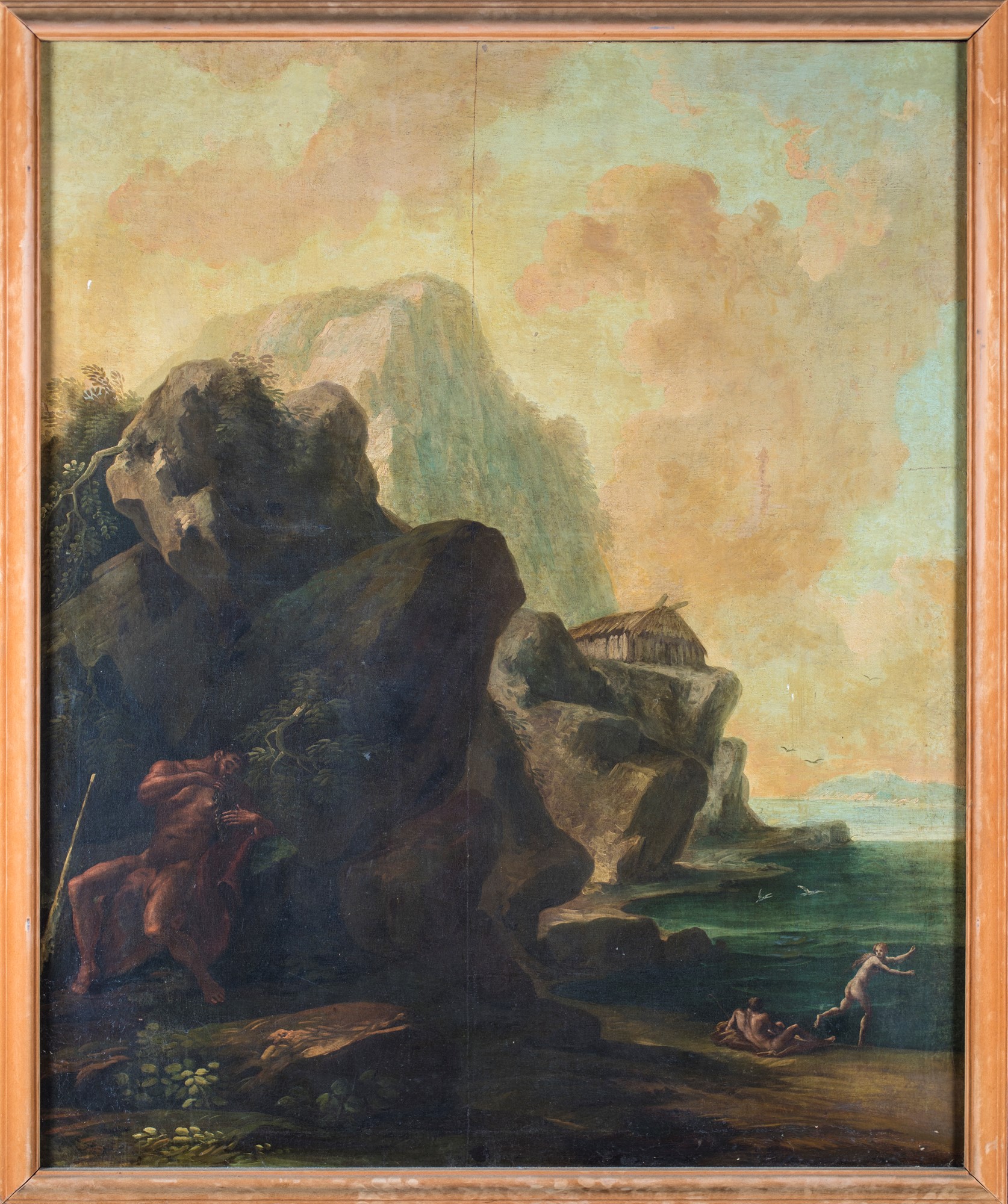 Pittore del XVIII secolo - Scogliera con Ercole che suona la cetra e figure mitologiche in lontananza - olio su tela - cm 155x127