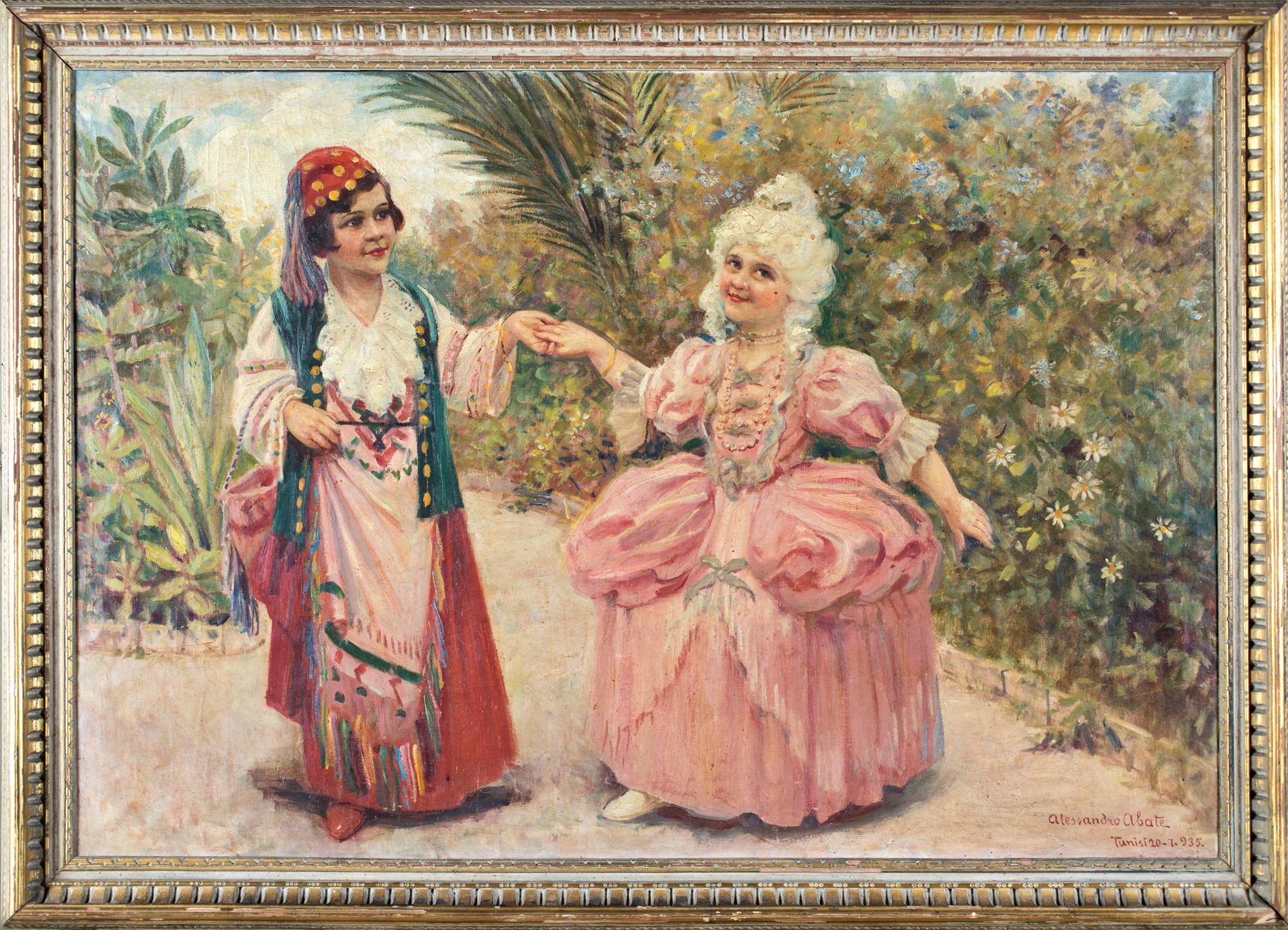 Alessandro Abate - Bambine in costume carnevalesco - Firmato e datato in basso a destra: Alessandro Abate Tunisi 20.7.935 - olio su tela - cm 96x140