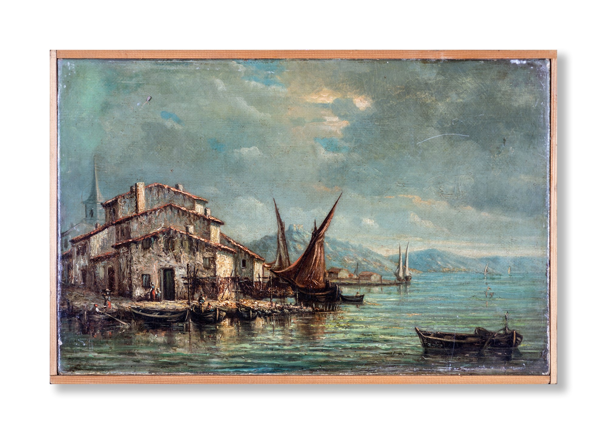 Pittore fine del XIX secolo - Borgo marinaro - olio su tela - cm 35x53