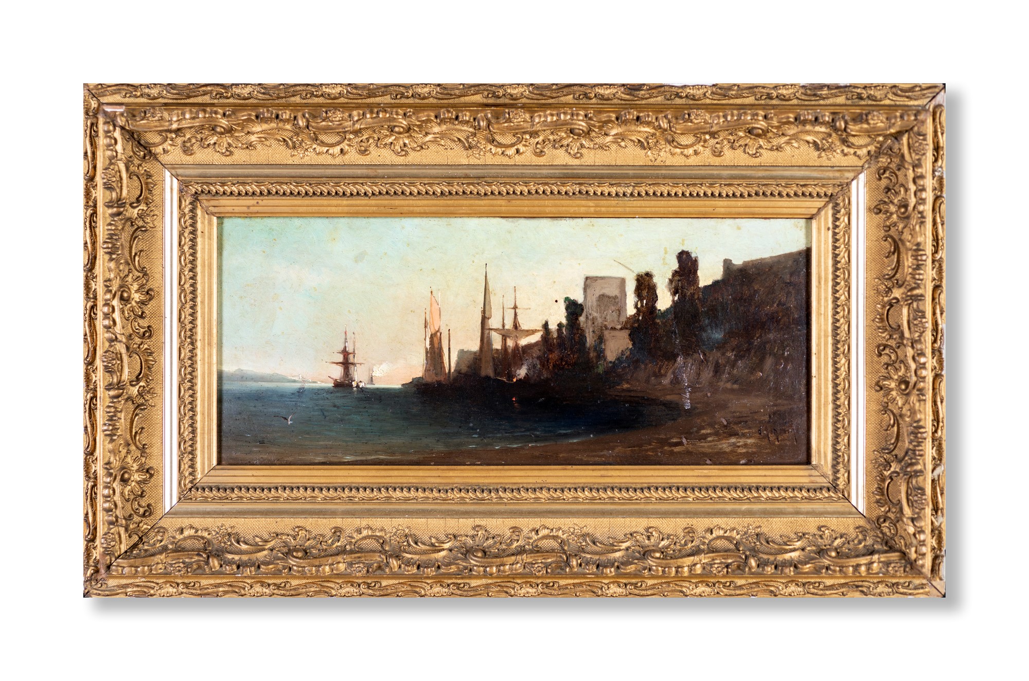 Scuola francese del XIX secolo - Marina con velieri - Firmato in basso a destra - Olio su tavola - cm 23x56